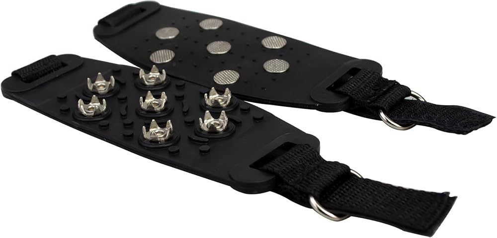Front of footwear crampon: Facilitate heel-to-toe transition; Material: Mn-steel Spikes + Silica Gel Base + Nylon Strap; Size adjustment : Adjusts to boot sizes from 4 to 10.5; Color: Black