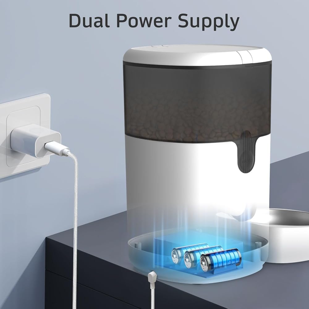 Reliable Power Supply : Equipped with dual power sources and special memory settings, the automatic cat feeder can be powered by a 5V DC adapter or three D batteries (not included). Even during power outages, your pet can continue to self-feed.