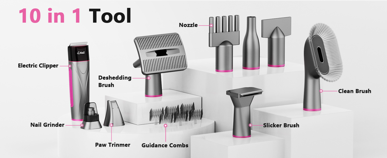 10 in 1 Pro Pet Grooming Kit: Our pet vacuum for dogs with specialized tools and attachments can help you groom your pet more efficiently and easier. The brush and the deshedding tool can help you remove tangles and knots, while the nozzle attachment can help you get into hard-to-reach areas, such as around your pet's eyes and ears. Electric clipper, dog paw trimmer and dog nail grinder provides excellent cutting. Cleaning brushs can be used for collecting pet hair falling on the carpet, sofa.
