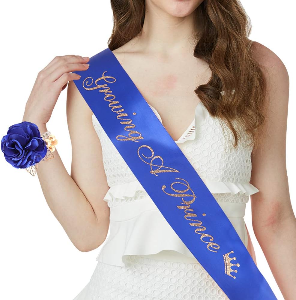 Kit contains a royal blue wrist corsage and a "Growing A Prince" sash.
