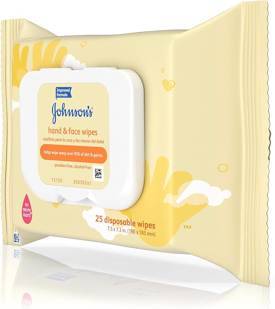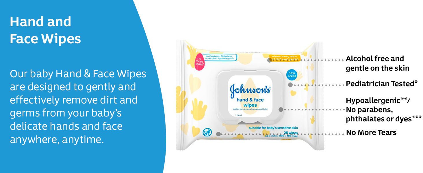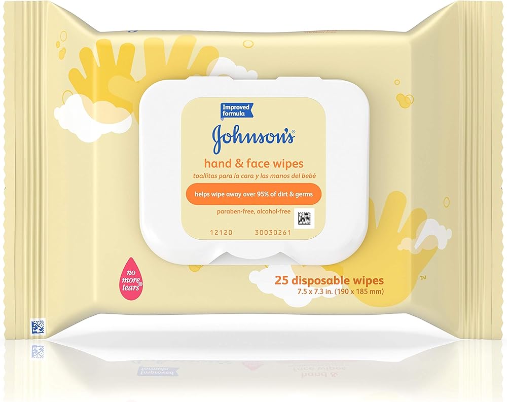 Gently and effectively clean your baby's delicate hands and face with Johnson's Baby Hand & Face Wipes. These baby wipes remove over 95% of dirt and germs and come in a handy re-sealable package for on-the-go cleansing. The No More Tears formula is as gentle to eyes as pure water. These baby wipes are paraben and alcohol-free and allergy-tested.