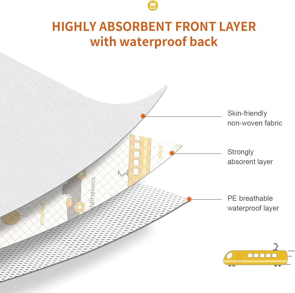 【Skin-Friendly Design】Made of 3 combination layers of non-woven fabric, absorent polymer, breathable and waterproof PE film. Paper front with strongly absorbency, anti-leakage lining prevent liquid penetration and keep clothes dry and clean.