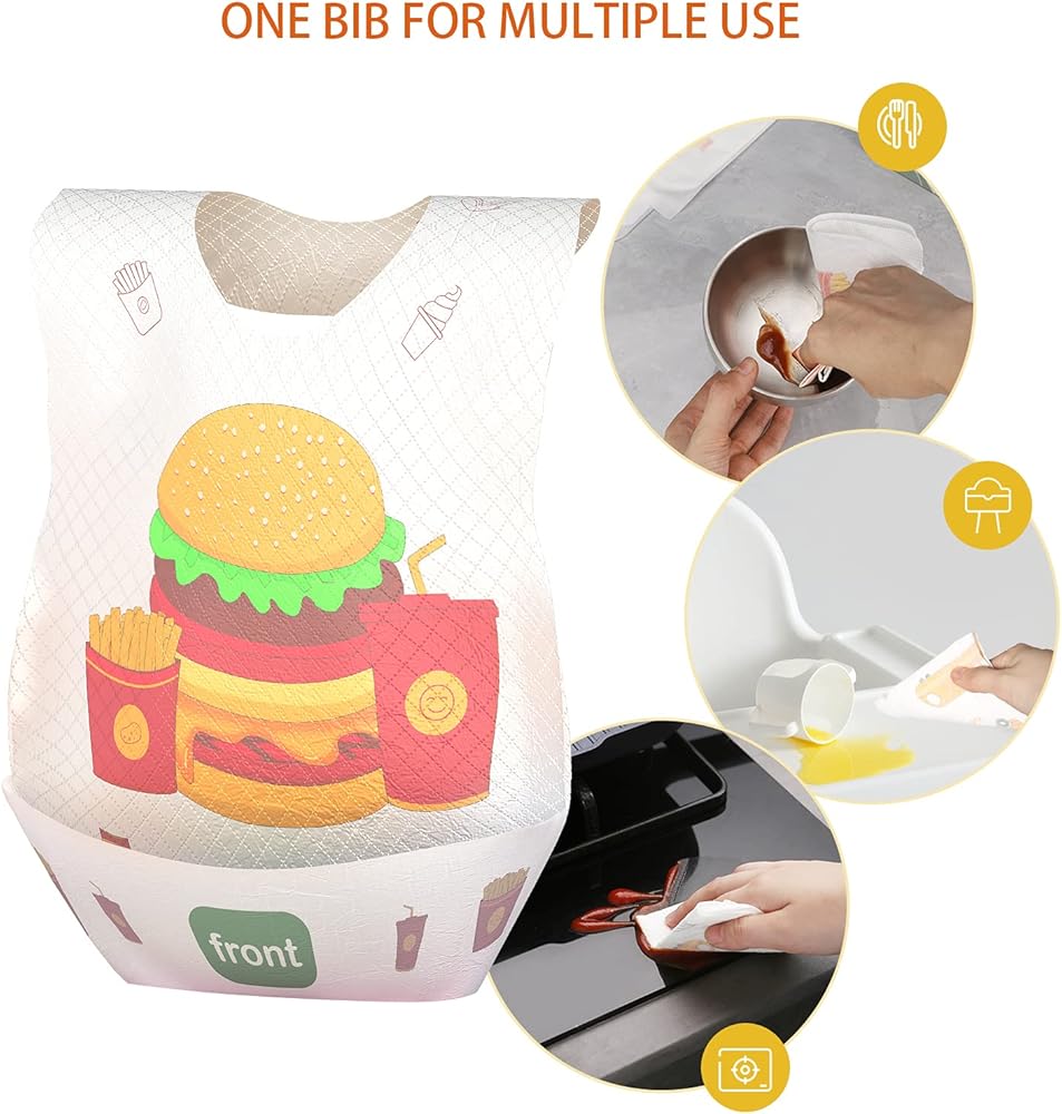 【Multifunction Use】 Not only travle bibs but also cleaning cloths that can clean the tabletop and wash the dishes. They take up little space in your bag and can be easily disposed at the end of a meal or after use.