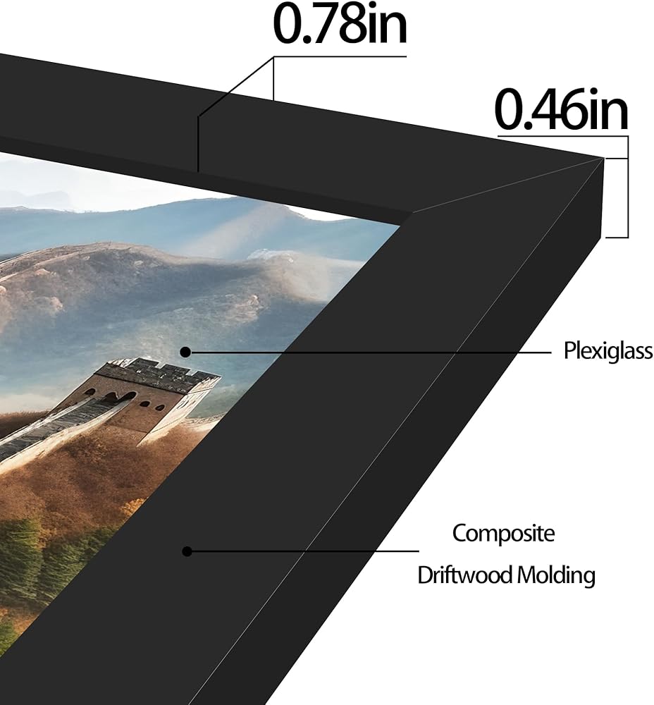 【ECO FRIENDLY MATERIAL】:11x17 picture frame is made of high quality MDF wood, finished with the flat black accents, plexiglass and smooth & rigid backing and pre-attached stamped hanging hardware.