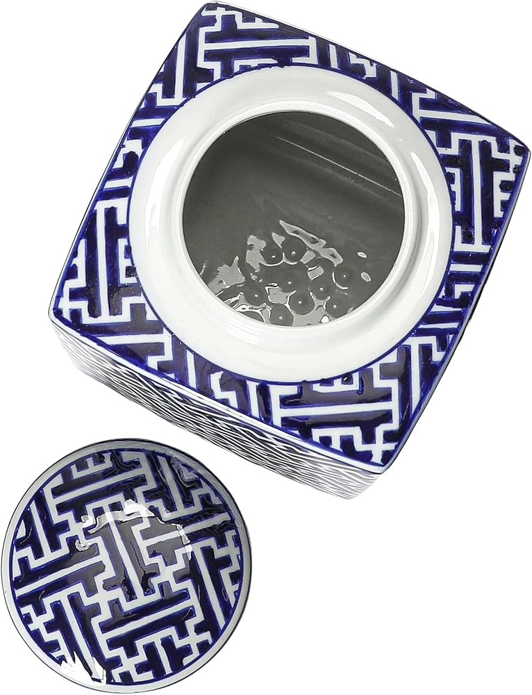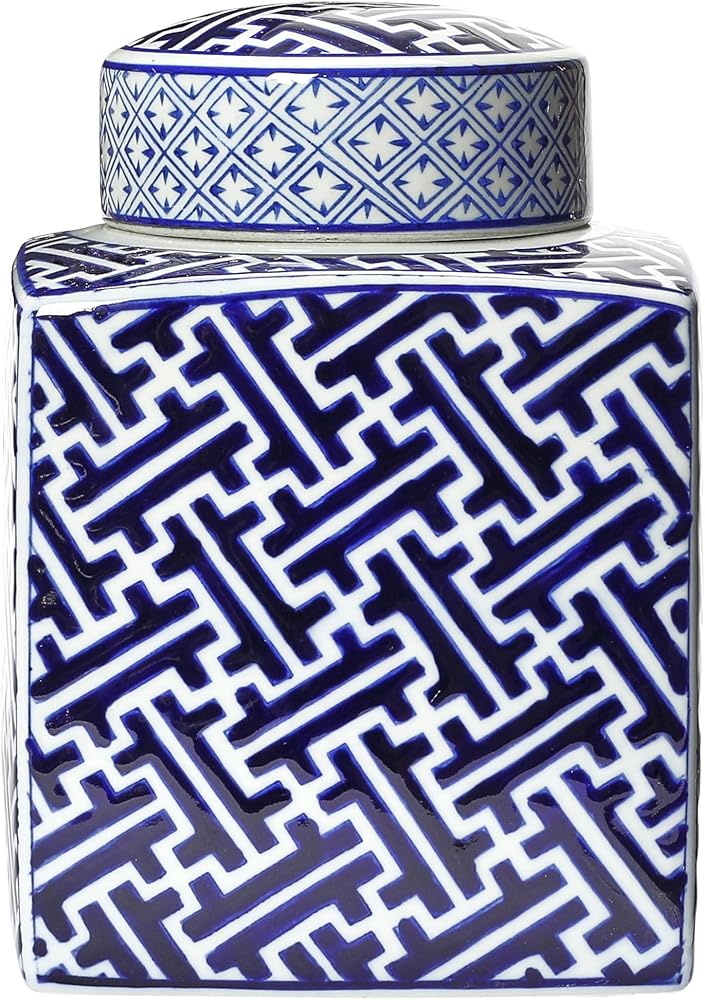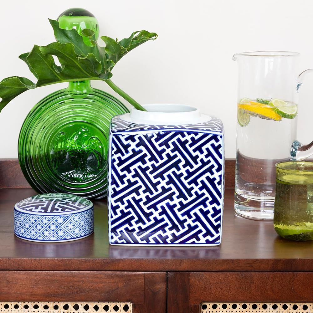This delicately crafted ginger jar showcases a modern take on a classic silhouette with an intricately painted pattern and semi gloss finish
