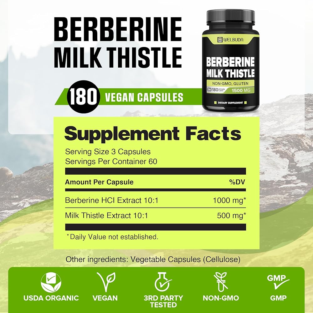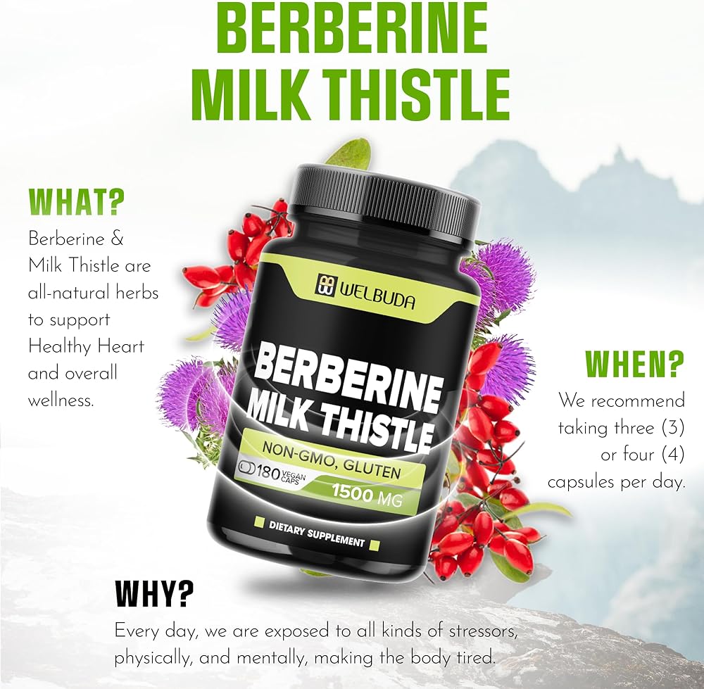 WELBUDA Berberine Supplement with Milk Thistle 1500mg - 180 Capsules - Highly Concentrated Formula for Support Immune System, Circulatory System & Overall Health