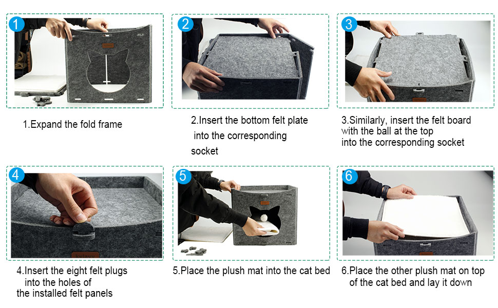 سرير القطط سهل التجميع: قم بفك إطار بيت القطط المطوي، وأدخل كل من لوحتي اللباد في الرافعات العلوية والسفلية المقابلة، وأدخل سدادات اللباد الثمانية في الفتحات. ضع وسادتين ناعمتين، واحدة في بيت القطط والأخرى في الأعلى. يمكن طي سرير القطط إلى ألواح بسمك 1.8 بوصة لسهولة التخزين أو النقل.