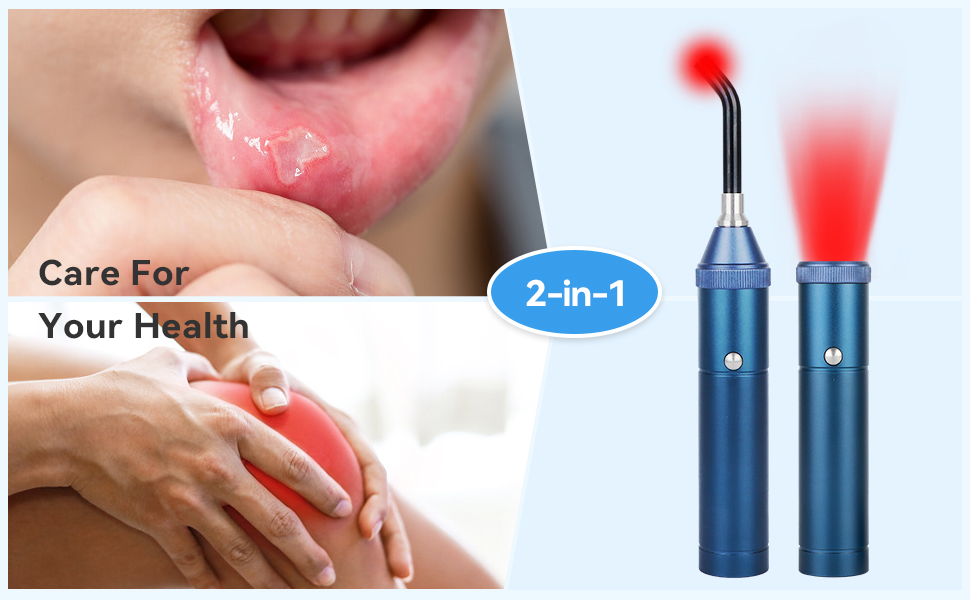 【TWO- IN- ONE】: The device for face and body is equipped with a removable tip. it can be used for face pain, such as canker sore, ear, nose and cold sore treatment. When the tip is removed, it is equivalent to a handheld red light therapy wand, which can be used for body pain relief,such as wrist, knee, foot, and joint pain.