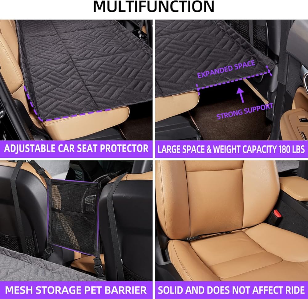 【Anti-slip design】The dog hammock for car has 2 straps that go around the front seats to keep the bed firmly in place. And does not affect the comfort of the front passenger ride.Both sides of the non inflatable car mattress is made of non-slip material.
