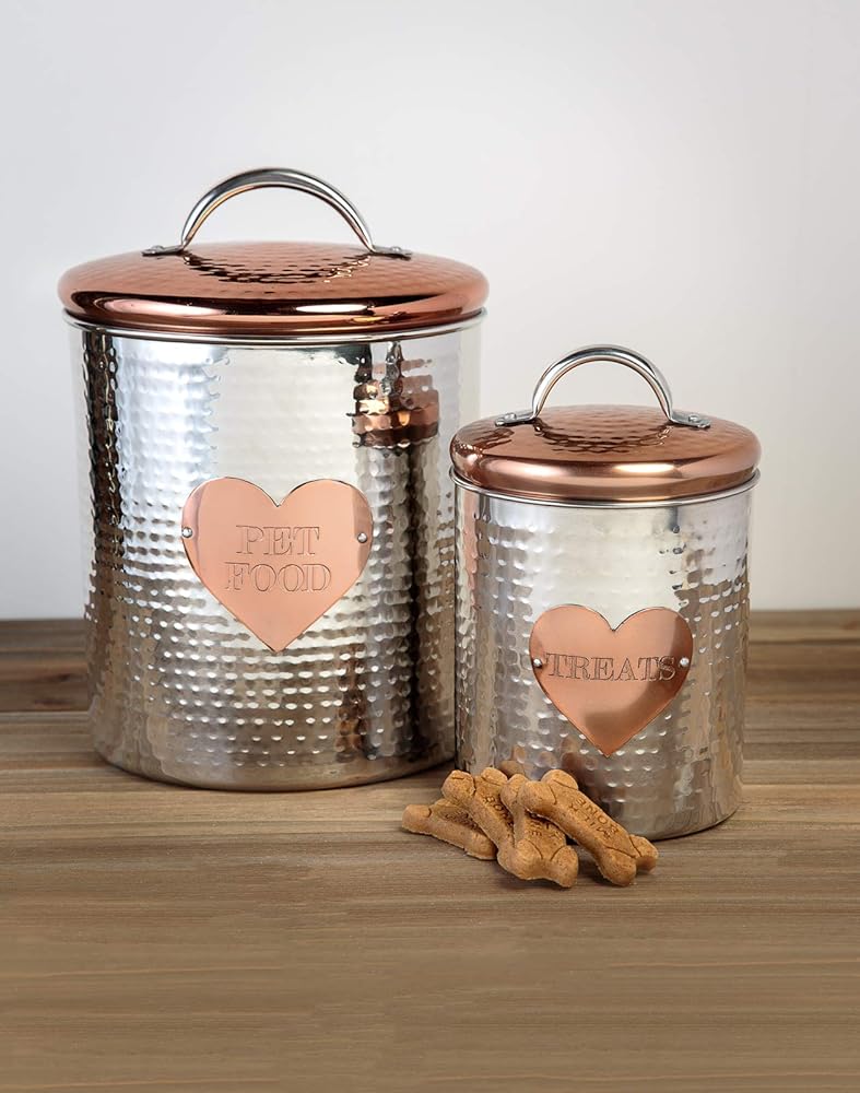 Amici home's rosie pet xl canister features a dimpled stainless steel construction with a sleek rose golden nameplate featuring the appropriate label pet food