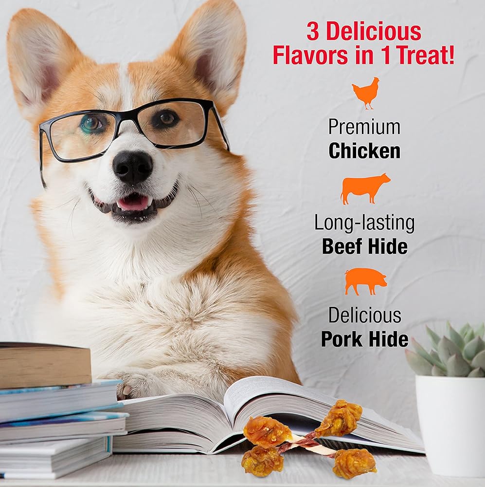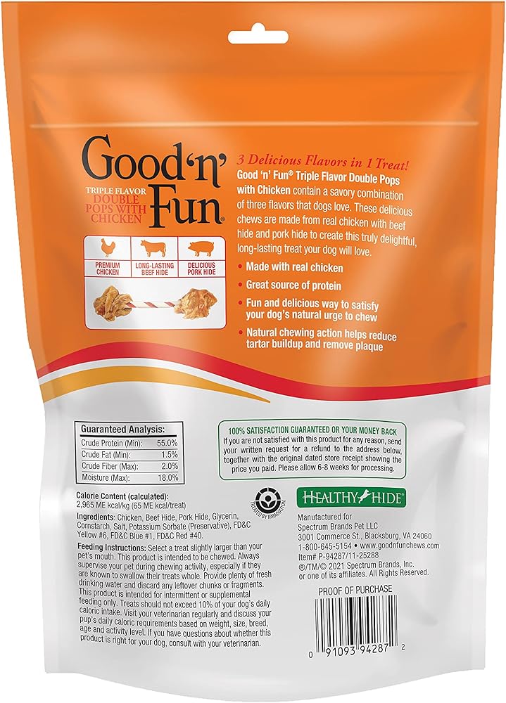 Good ‘n' Fun brand offers a tasty variety of flavors that dogs love. These delicious chews are made from the finest ingredients, including real chicken and real beef hide, to create truly delightful, long-lasting treats your dog will love.Tails will wag for these flavor-packed Good ‘n' Fun Triple Flavor Double Pops with Chicken because they're made with a savory combination of three flavors that dogs love. These delicious chews are made from real chicken with beef hide and pork hide to create this truly delightful, long-lasting treat. Good ‘n' Fun Triple Flavor Double Pops with Chicken are a great source of protein, plus they're a fun and delicious way to satisfy your dog's natural urge to chew. The natural action of chewing also helps to reduce tartar buildup and remove plaque. These double pop-shaped snacks make for long-lasting entertainment.Feed one Good ‘n' Fun Triple Flavor Double Pop with Chicken per day. For intermittent or supplemental feeding only, and for supervised consumption only. Select a chew slightly larger than your pet's mouth. Discard chunks or fragments. Always provide plenty of fresh drinking water and visit your veterinarian regularly.