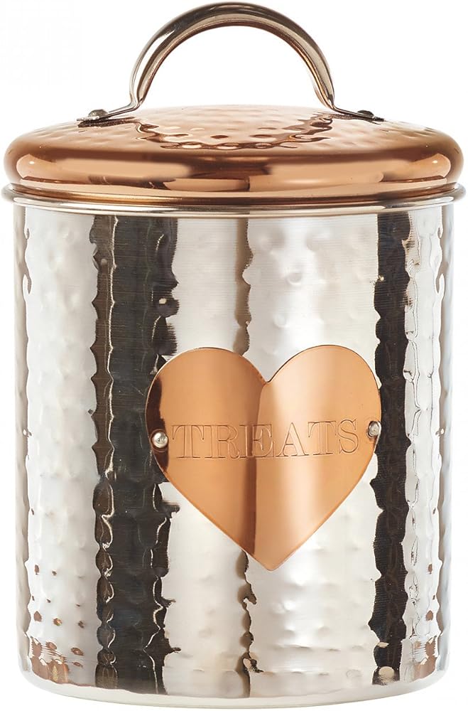 Amici Home's rosie pet canister features a dimpled stainless steel construction with a sleek Rose gold nameplate featuring the appropriate label "treats". this lovely canister boasts a 38-Ounce Capacity and is topped with a beautiful Rose gold lid. Your pet will love the fresh treats in this canister, and you will adore how it looks in your home. Measuring 4.5" L x 4.5" W x 7" H, this stainless steel canister requires handwashing to maintain its beauty and functionality.