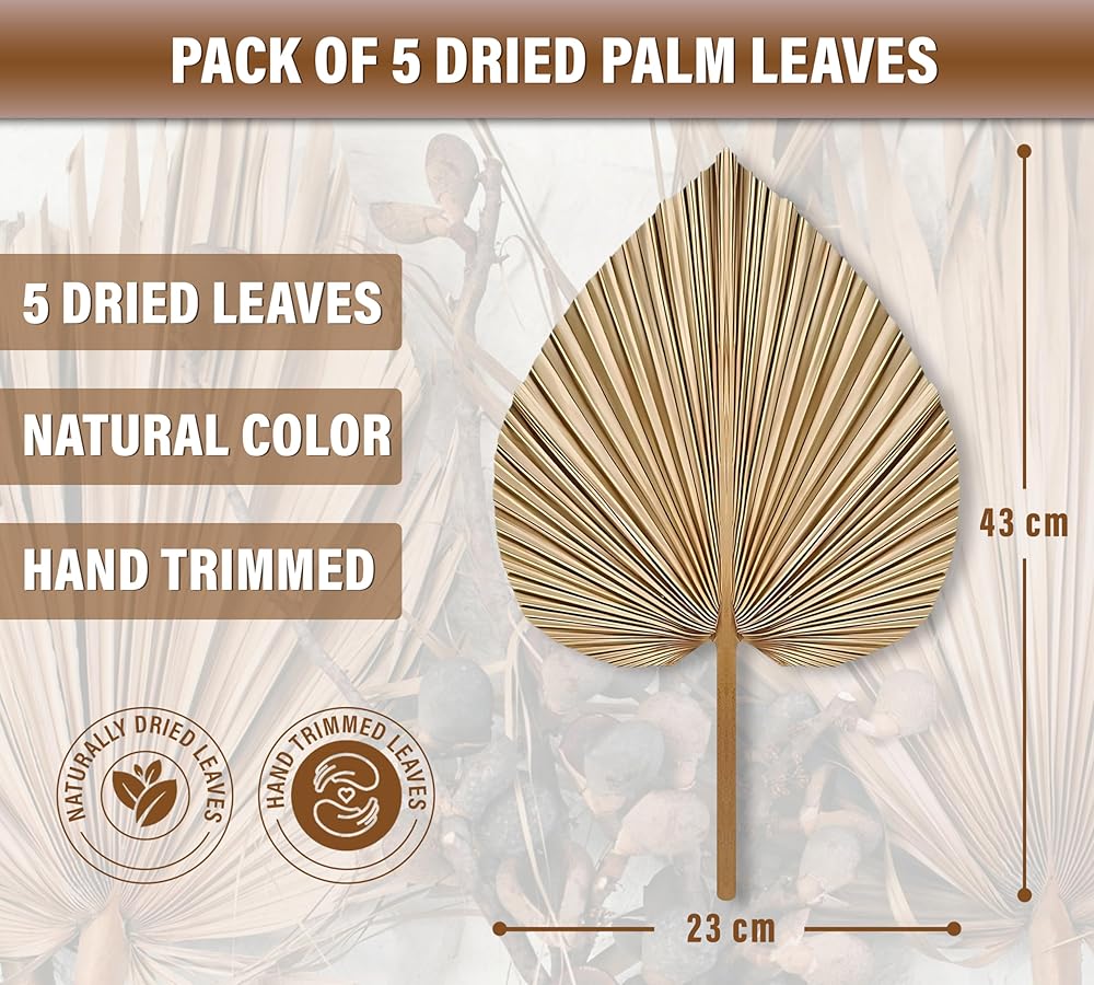 PACK OF 5 DRIED PALM LEAVES: Dive into a bundle of creativity! Each pack includes 5 stunning dried palm leaves, generously sized at about 17 x 9 inches. These beauties come in a sturdy box, ensuring to deliver in perfect shape. Ready for your personal touch, these palm leaves are like a blank canvas, waiting for you to cut and style them just the way you like. Unwrap the magic and transform your space with our fantastic set of 5 palm leaves!