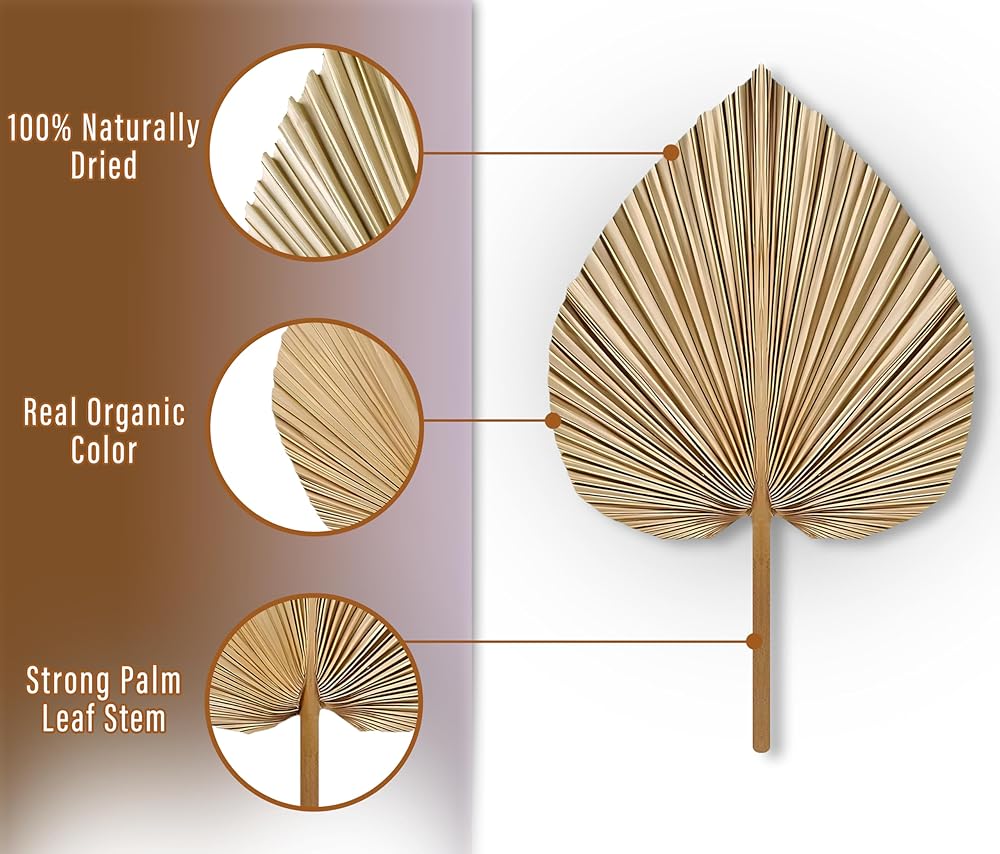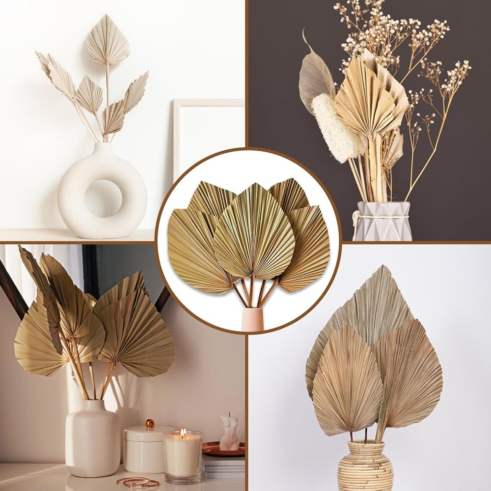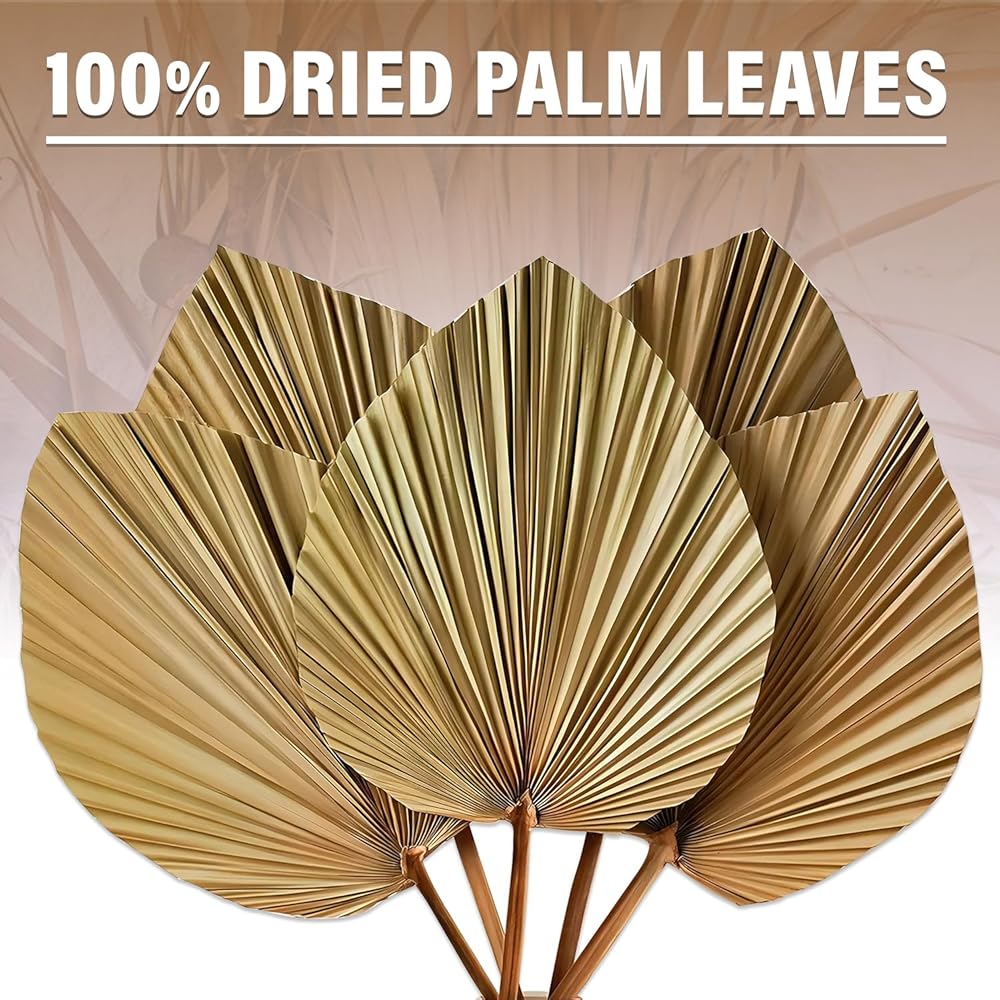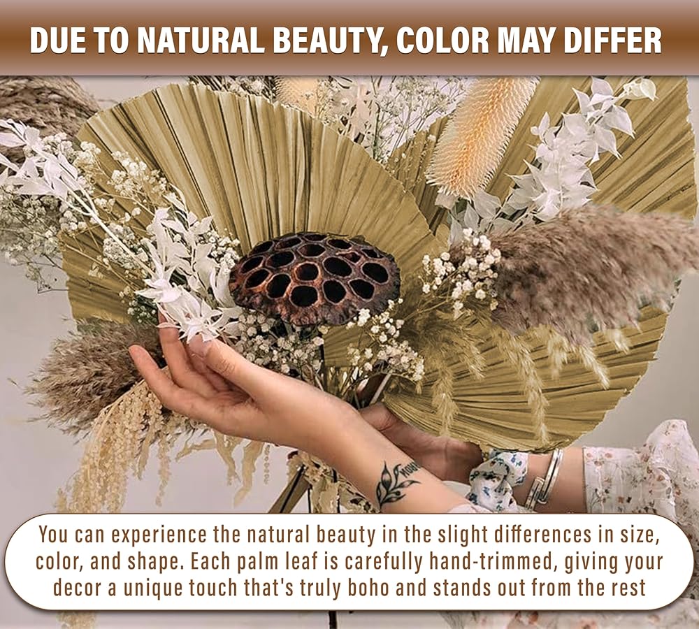 NATURALLY DRIED PALM LEAVES WITH STEM: Immerse yourself in the authentic beauty of nature with our dried palm leaves – sourced straight from nature and air-dried with natural process. You can experience the natural beauty in the slight differences in size, color, and shape. Each palm leaf is carefully hand-trimmed, giving your decor a unique touch that's truly boho and stands out from the rest
