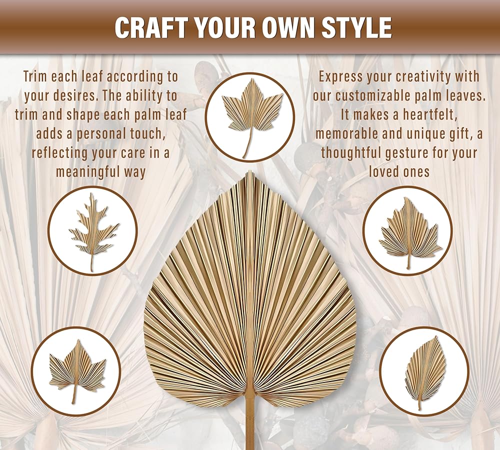 CRAFT YOUR OWN STYLE: Express your creativity with our customizable palm leaves. Trim each leaf according to your desires, adding a personal touch that turns your decor into a reflection of your unique style. It makes a heartfelt and unique gift, a thoughtful gesture for your loved ones. The ability to trim and shape each palm leaf adds a personal touch, reflecting your care in a meaningful way