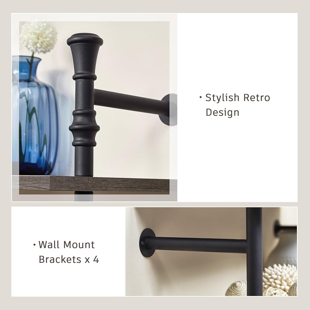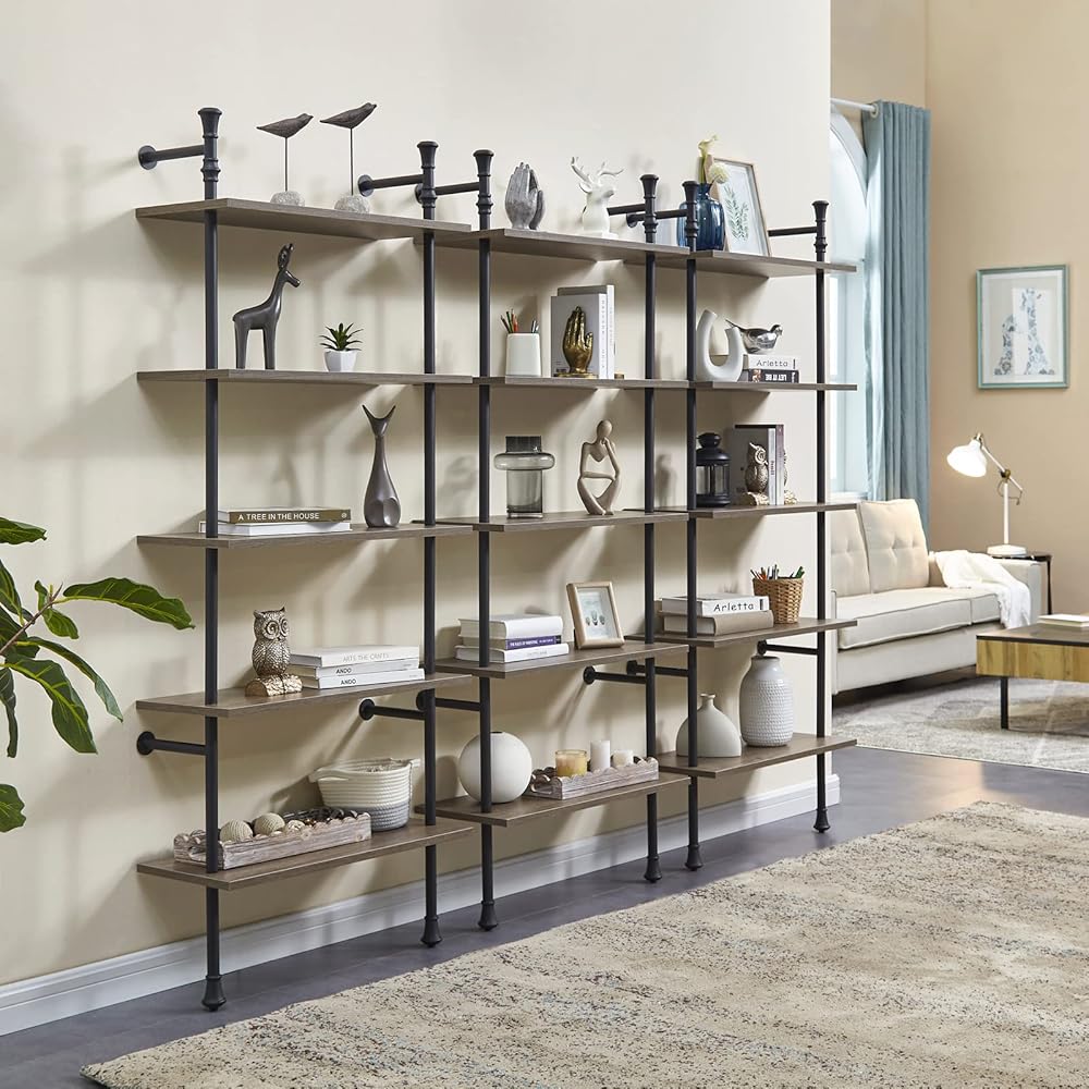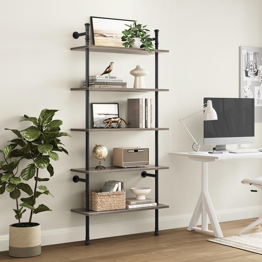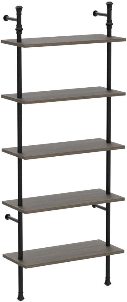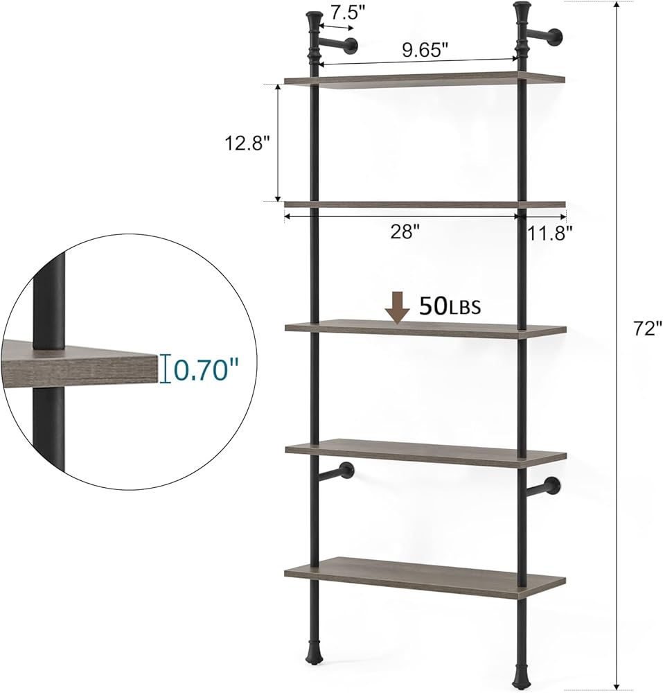5 Tier Shelf, Wall Mounted Bookshelf, Industrial Bookcase, Open Display Shelves Tall Modern Book Case Standing Leaning Wall Shelves for Living Room Bedroom Home Office Kitchen, Oak Gray