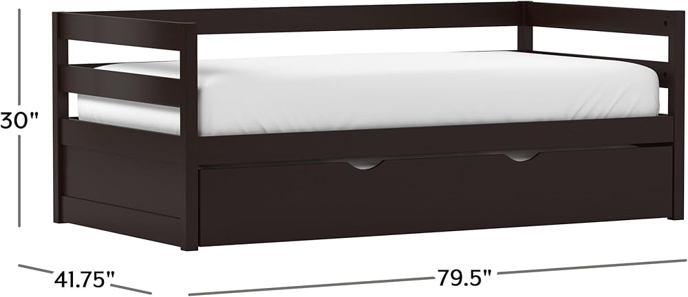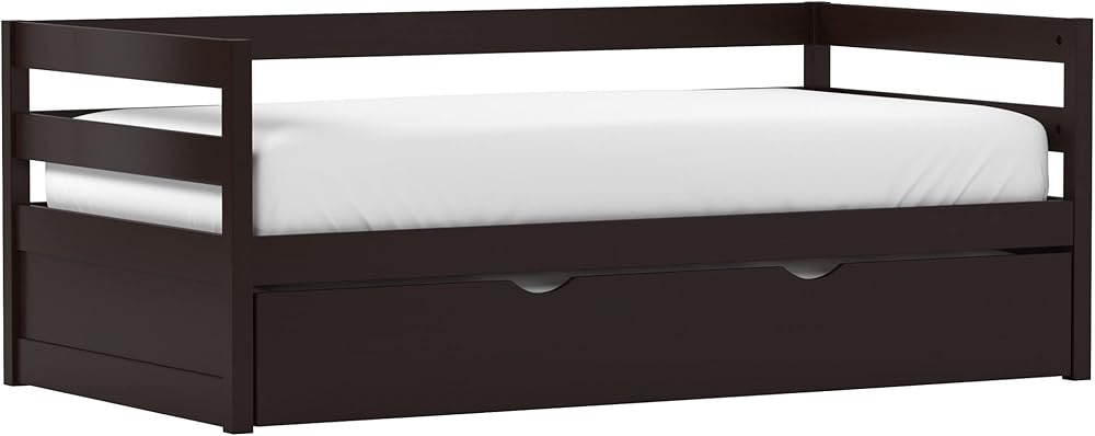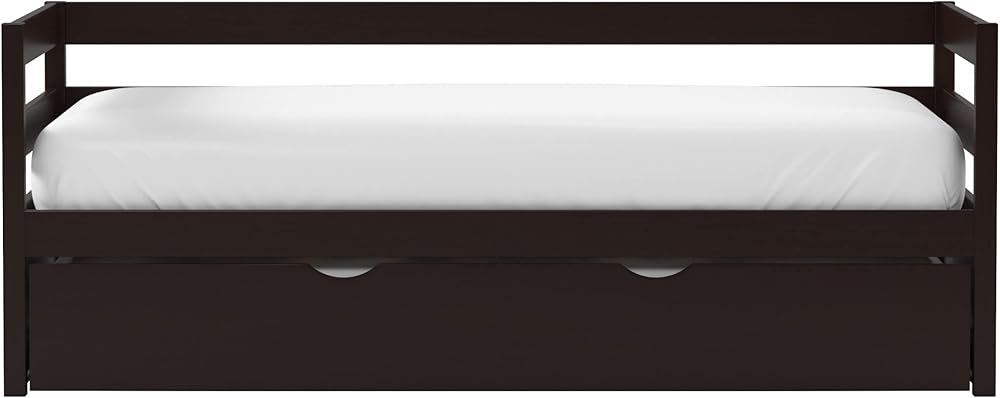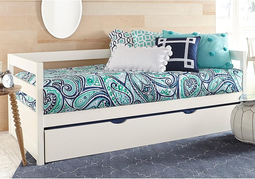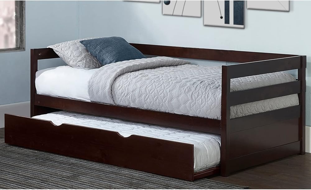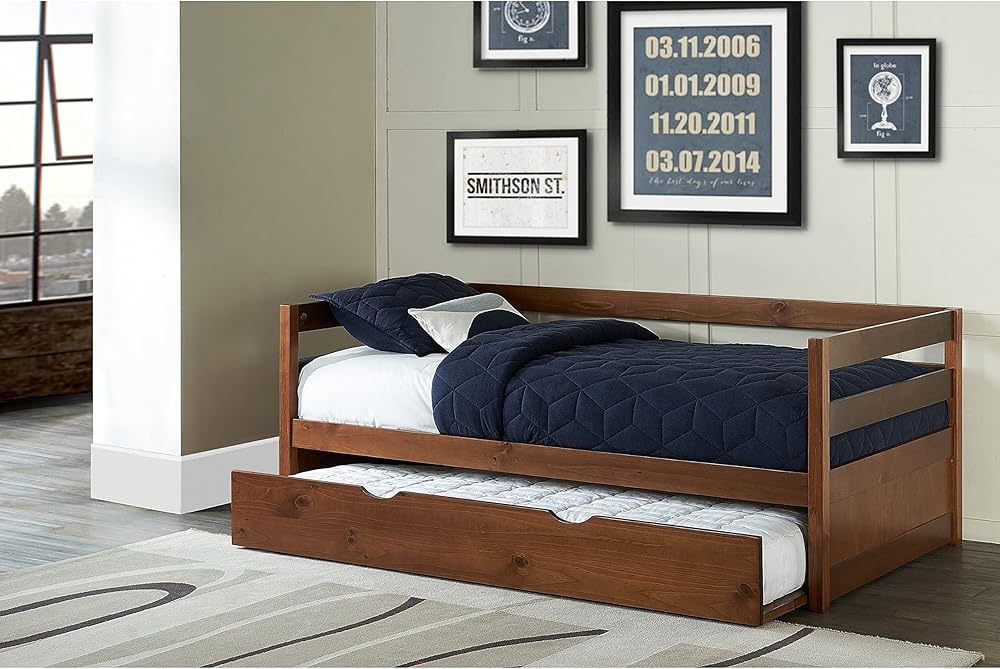 Modest slat style wood twin size daybed with easy to roll out twin trundle