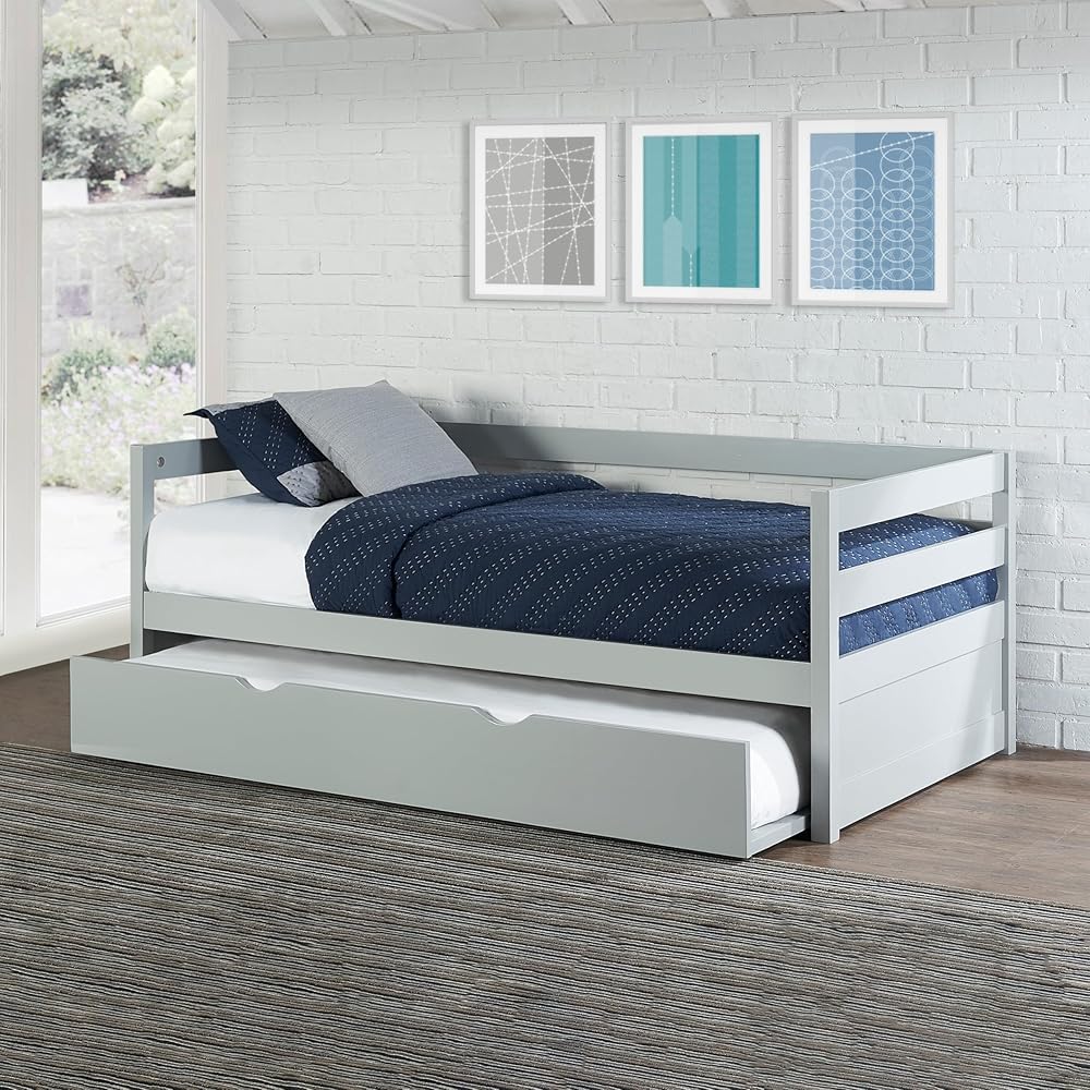 Create the perfect space for overnight for your child or guests in your home office, spare room, guest room or play room. The Caspian Twin Daybed with Trundle is the ideal solution for your small space resting area. Featuring a simple slat style accented by a neutral gray finish, this daybed is the perfect addition to your home. Box spring not required; Requires Two Twin Mattresses; Not included. Assembly required.