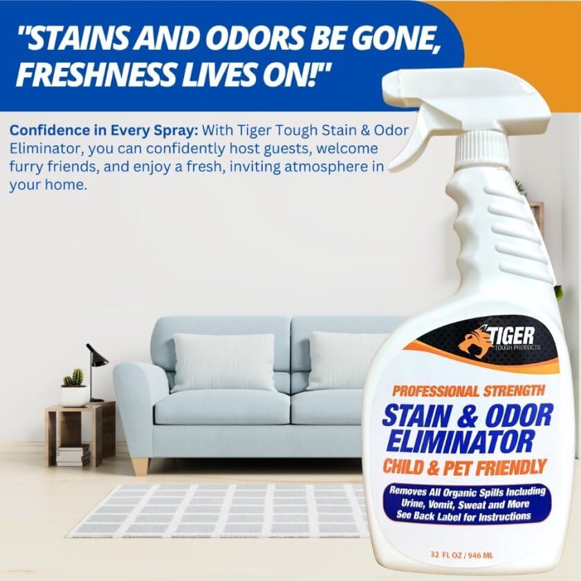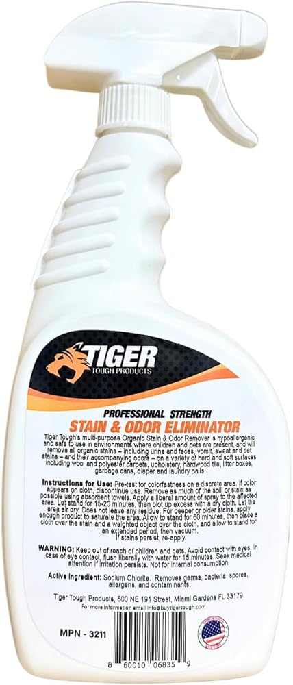 Tiger Tough's Professional Strength Stain and Odor Eliminator removes all organic matter and their associated odors including urine, vomit and sweat and the smells associated with your pet's presence in your home. Our Stain and Odor Eliminator works on much more than pet urine; any organic stain including vomit, poop, feces, pee, whether human or animal, lifts out of rugs, carpets and upholstery easily and completely. Tiger Tough's Professional Strength Stain and Odor Eliminator is child and pet friendly, safe to use at home so you don't have to worry. Our Stain & Odor Eliminator works hard to get rid of the toughest stain and odor problems. For use on carpets, floors, furniture, clothing, litter boxes, kennels, carriers, your pet's living and sleeping areas, dog crates and carriers, litter boxes and anywhere your pet spends time at home. Also effective as for use to refresh upholstery, diaper pails, garbage cans, as a carpet cleaner, mattress cleaner and stain remover.