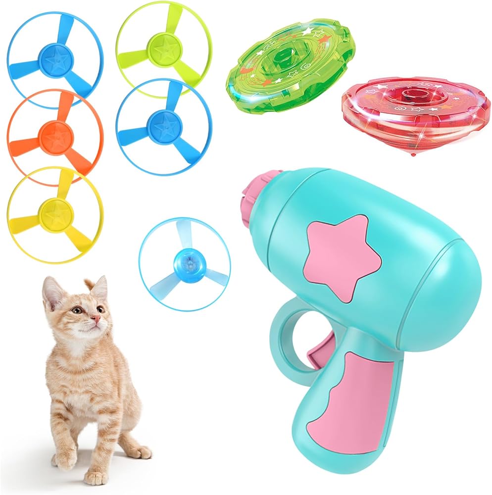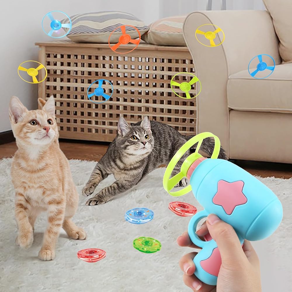 PAKESI Cat Fetch Toy with Colorful Flying Propellers Set,Enhance Kitten Training, Hunting Skills, and Interactive Chasing Fun (5 Regular Flying Discs, 1 Illuminated Flying Disc, 2 Gyro Discs)