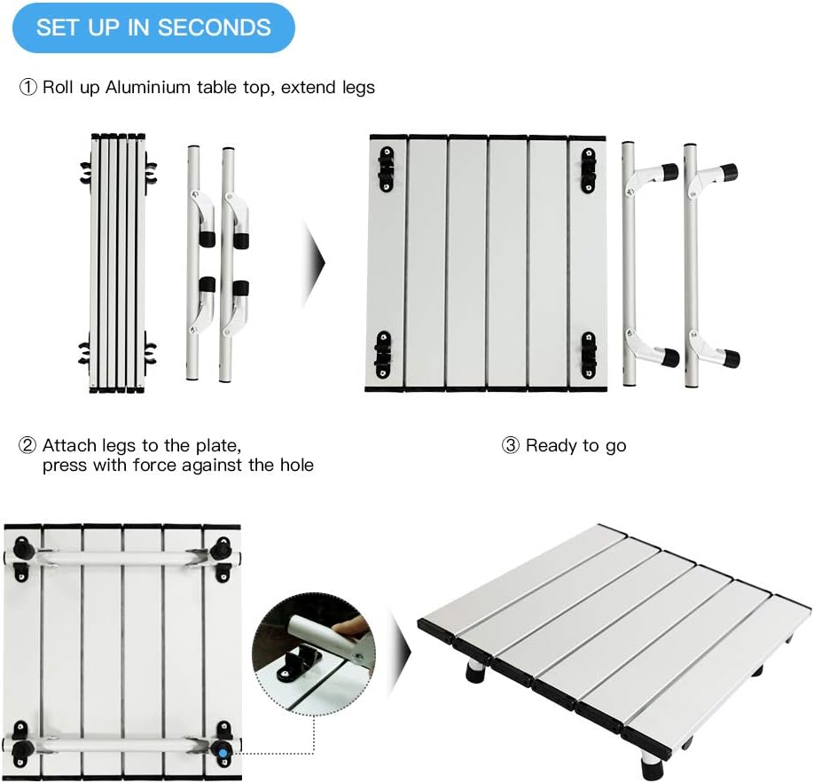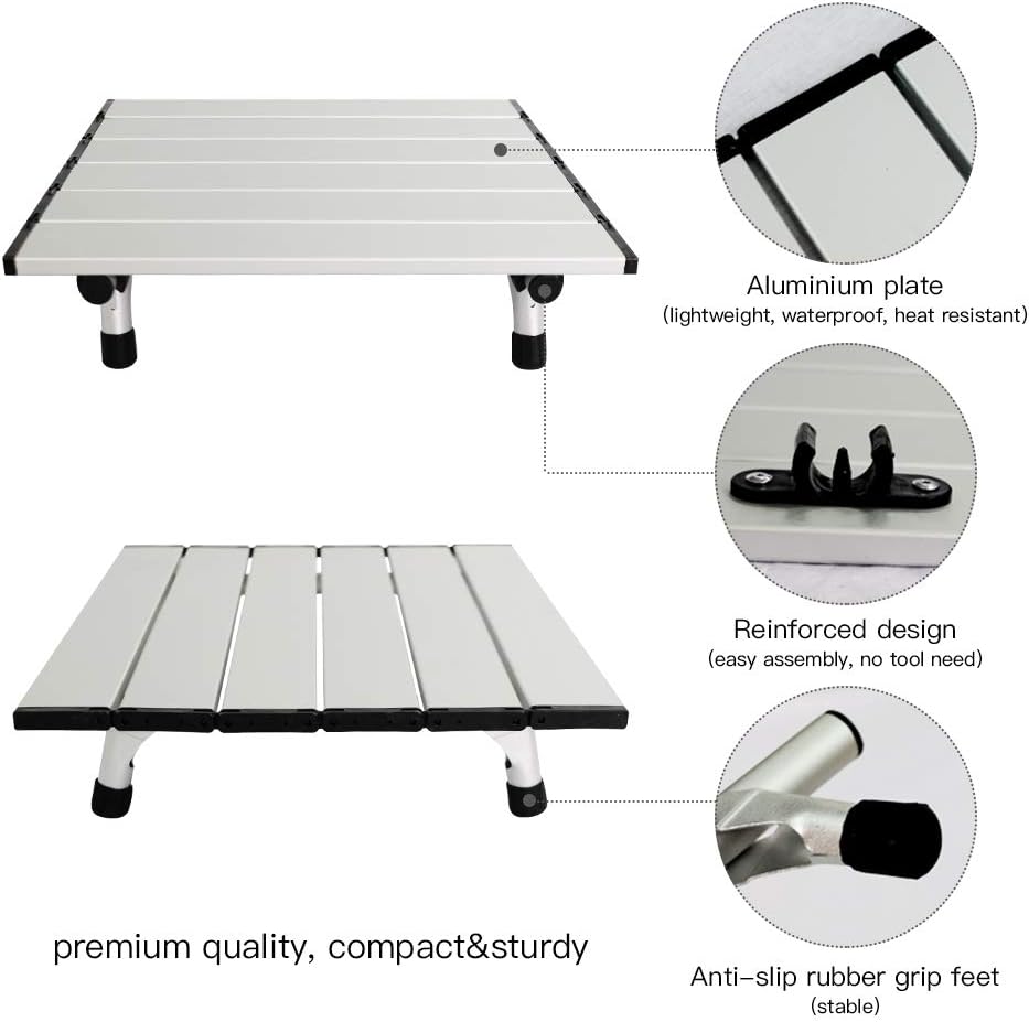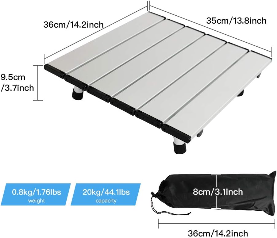 Lightweight & portable-The small picnic table Made of ultralight Aluminium material and only weighs 800g(1.76lbs). Come with a compact carry bag for easy transportation and storage.