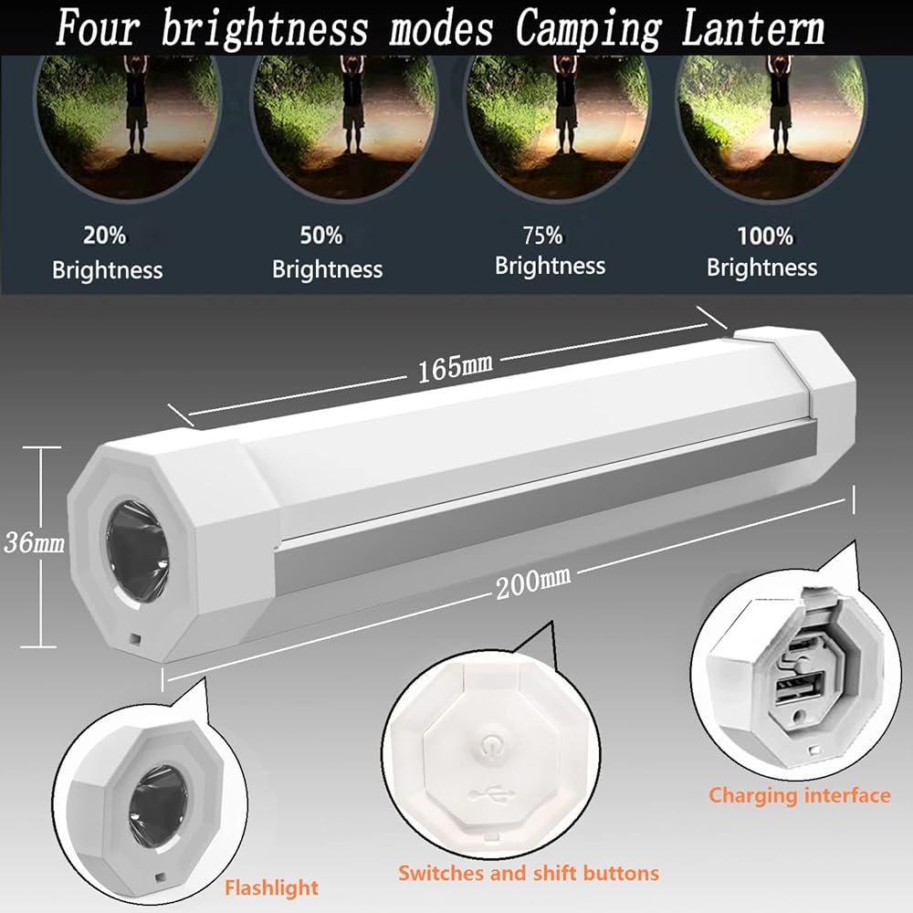 【6 Light Modes Camping Lantern】25% brightness mode, 50% brightness mode, 75% brightness mode, 100% brightness mode, standard flashlight mode, emergency SOS mode.The LED portable light can meet your different needs, and it's easy to switch modes with one button, suitable for hiking, camping, fishing, car repair, emergency, hurricane, or power failure. (Short press switches modes, long press about 2 seconds to realize off.
