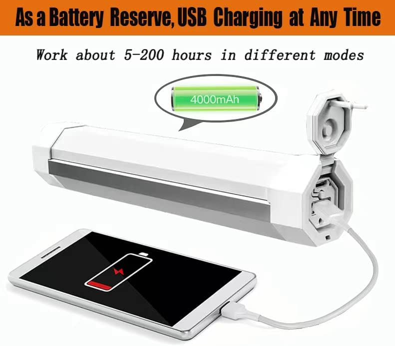【USB Rechargeable & 4000mAh Power Bank Function】The camping lantern light can be fully charged in 6 hours through the USB cable, and used about 5-200 hours in different modes. It also can be a power bank to charge your mobile phone or other devices during outdoor activities.