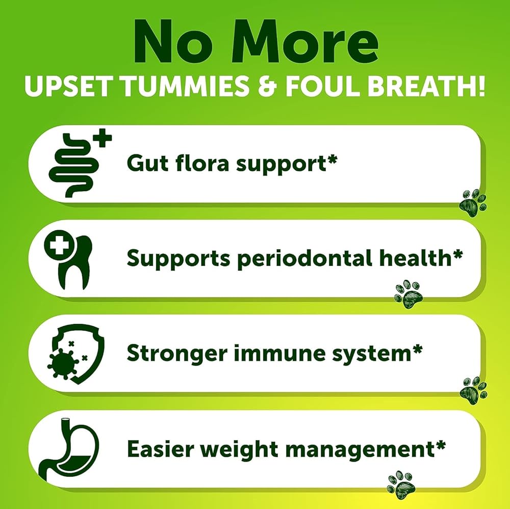 Gut Health Support: chews help with bad breath & bowel health. Our chewable treats help with no poop eating for dogs & aid with digestion, so your pup stays happy & healthy.