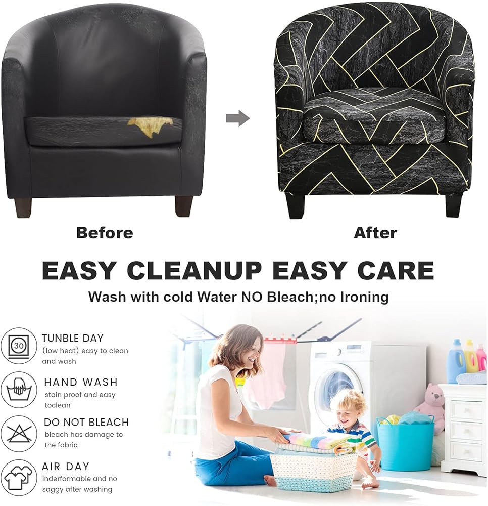 ✔【Easy to Install】Check the installation guide carefully, barrel chair cover can be finished within 3 minutes by one person. These tub chair slipcovers are easy to remove from the armchair for washing. Hand wash or machine wash with cold water; Hang dry; No bleach; No ironing. Wash separately at gentle cycle. Using mild laundry detergent.
