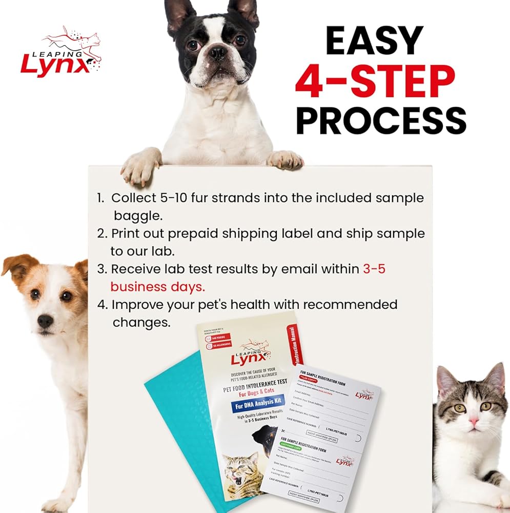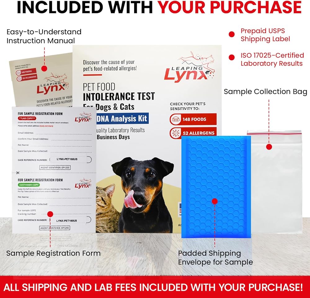 🐶 NONINVASIVE SAMPLING: this food intolerance test just requires a few strands of your pet's fur. The collection kit includes a plastic baggie for the fur, along with a return envelope and prepaid USPS label. Simply collect a few strands of fur and send them to our lab for analysis.