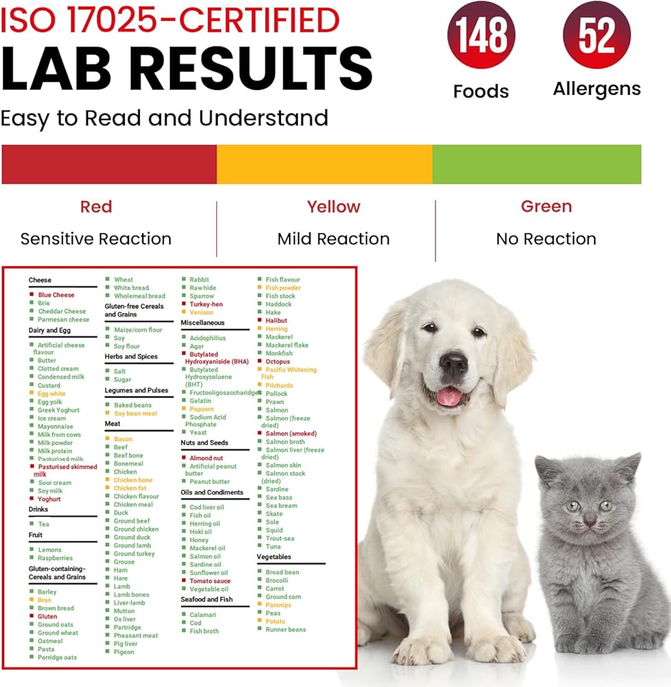 💟 IMPROVE YOUR PET'S HEALTH: if your dog or cat is frequently scratching, biting, dragging its booty or having stomach problems, the root cause could be in its food. This test kit analyzes 148 foods and 52 common allergens to get to the bottom of the problem, FAST! Test dogs or cats of any breed or age.