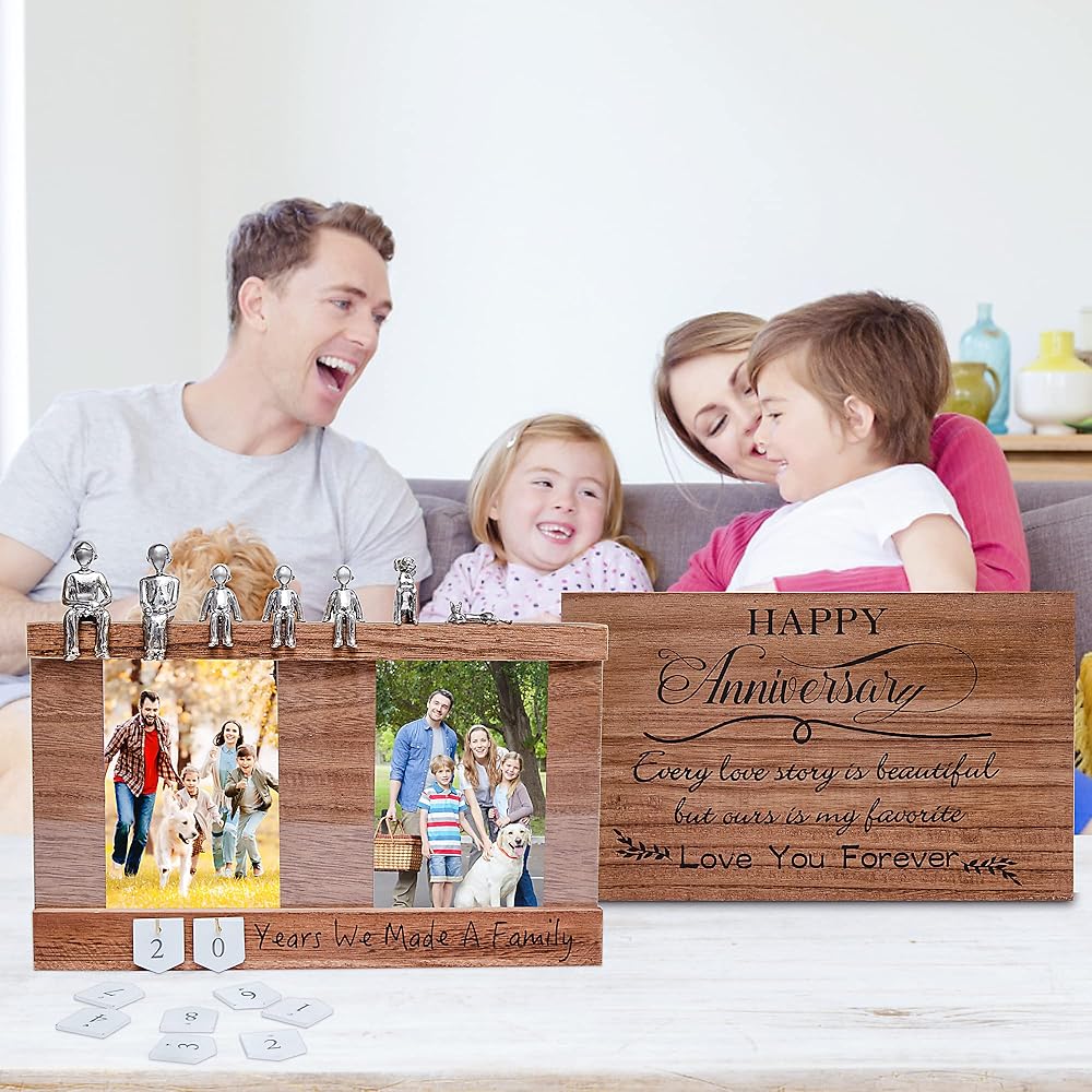 UNIQUE ANNIVERSARY GIFTS - This Gift Set Features a Hand Crafted Wooden Box with an innovative Design. Romantic and a creative way to present a gift for the 5th, 6th, 11th, 10th, 18th, 25th 50th or other years wedding anniversary, make a very special gift to her, your girlfriend or wife. The unique statue records the family members and can be added to the family as the year changes. Love picture frame records every moment together, and freezes the precious memories of the couple.