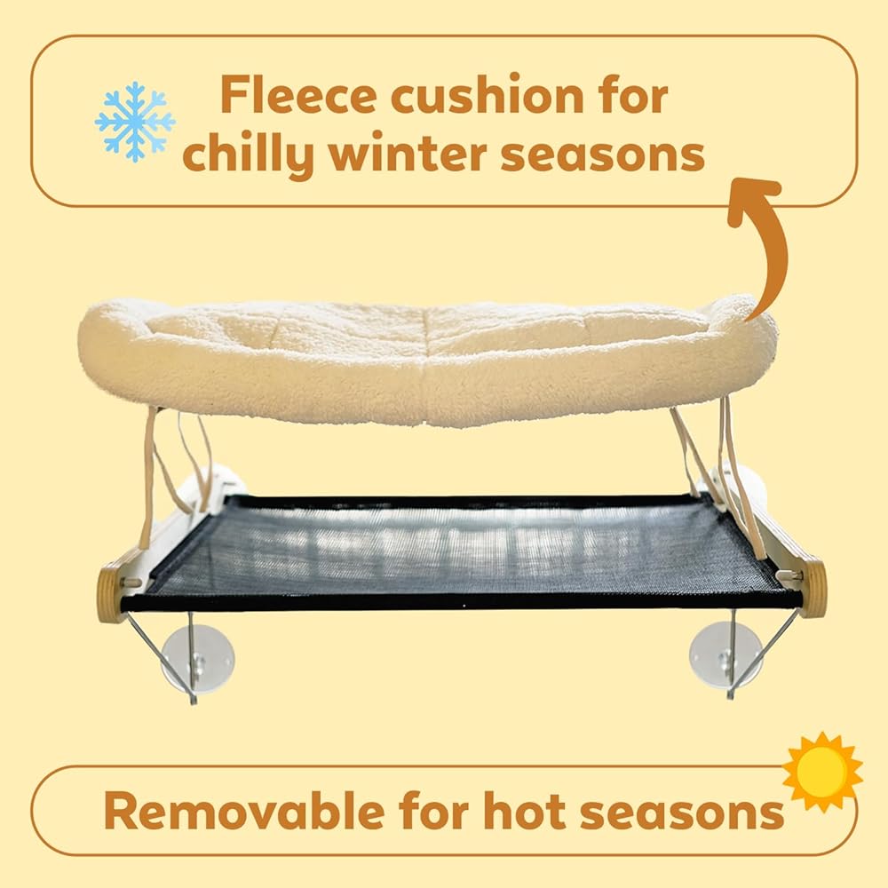 Cats naturally seek out warm spots to lie in, stretch out, and enjoy a good view. The Docabu cat window perch offers the perfect 360° sunbathing spot for your feline friend. The included fleece cushion will help keep your furry friend warm during the chilly winter seasons. In hot seasons, you can remove the cushion and use the cloth mat below only.