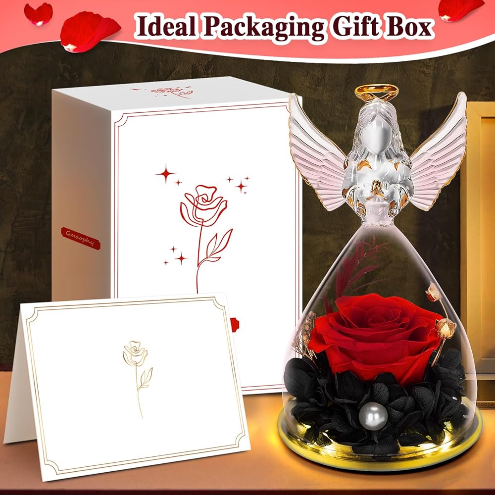 Beautiful Roses Forever Flowers Gift: Each glass angel figurine is handcrafted and flowers are hand-dyed, size and color may vary slightly from batch to batch. Our products comes with a gift box, a gift bag and a blank greeting card on which you can write your best wishes, no package need again. The embedded pearl cotton ensures that the angels figurines flowers will not be damaged during transportation. Glass is fragile, please keep it out of the reach of children and pets.