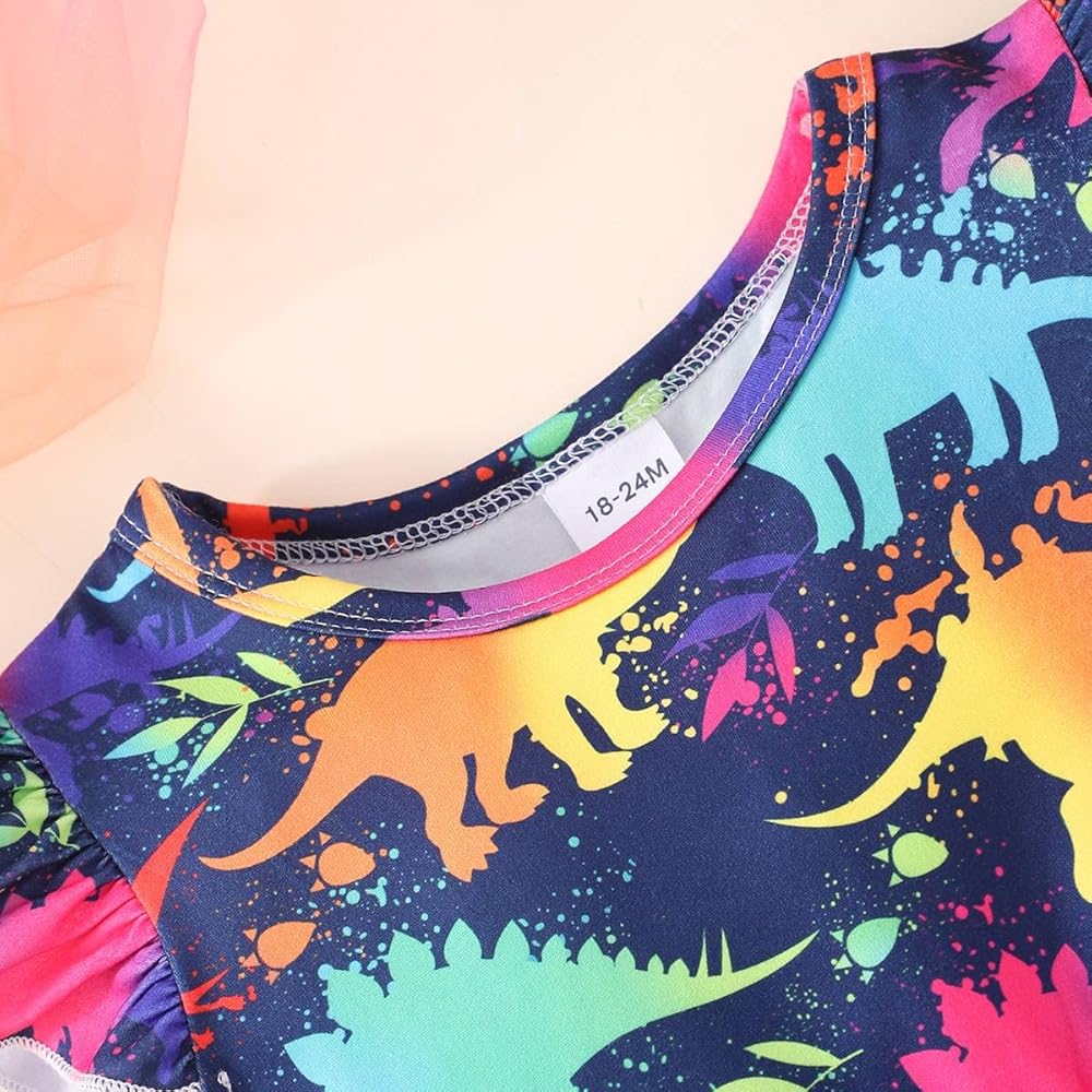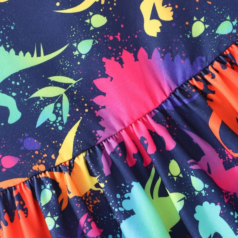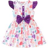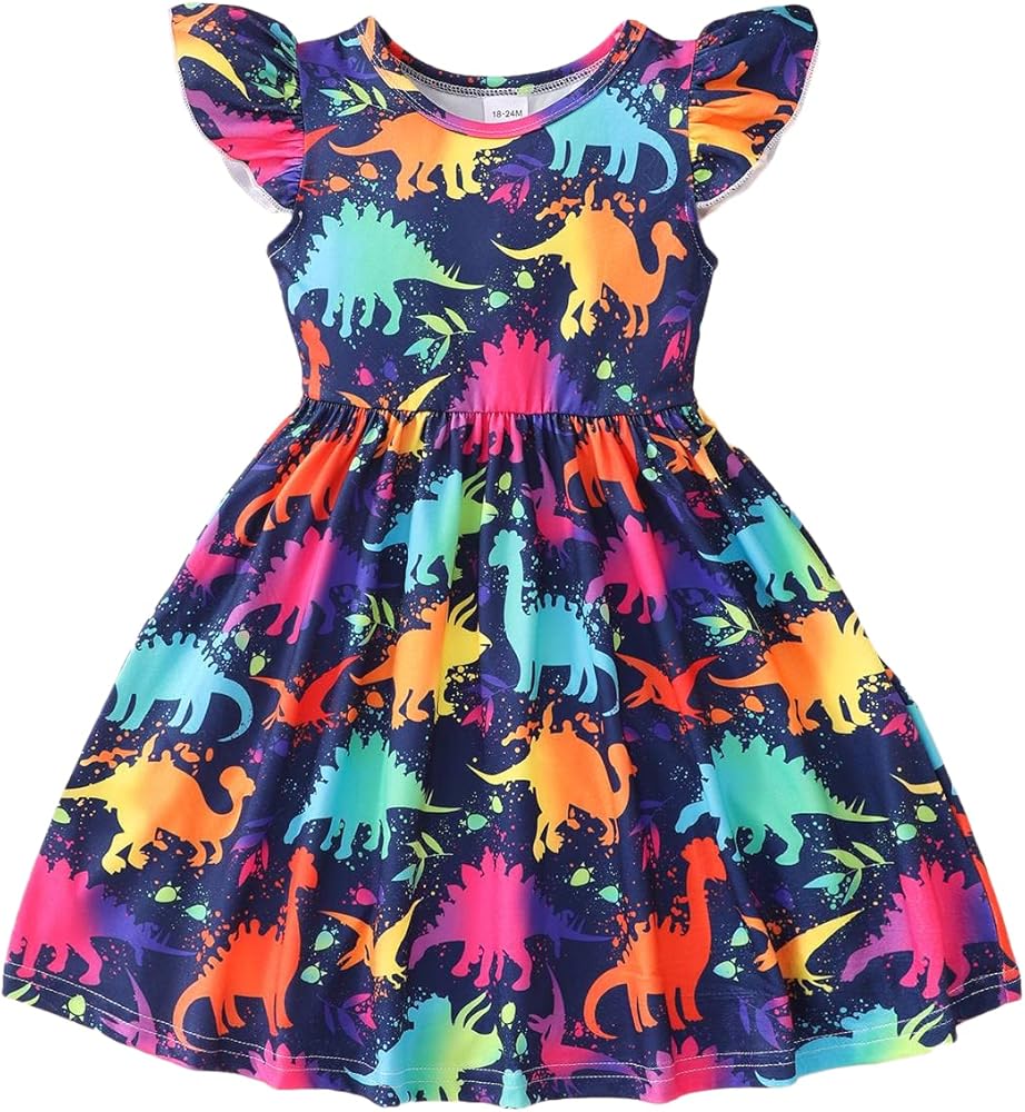 • unique design: Fashion summer spring dresses for toddler girls, adorable ruffle sleeve, Round neck, bow, Proper length,cartoon dinosaur pattern print, simple causal dress for daily wear, Your baby will got a lot of compliments on it!