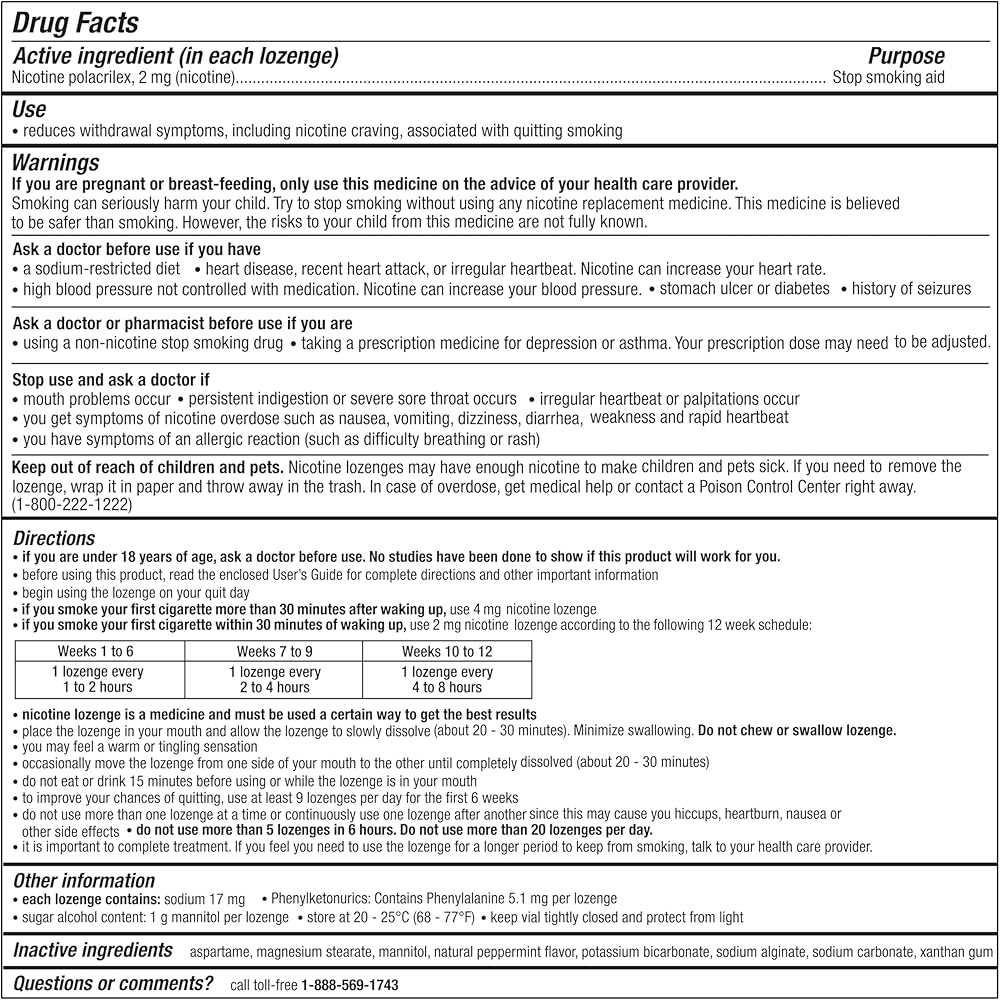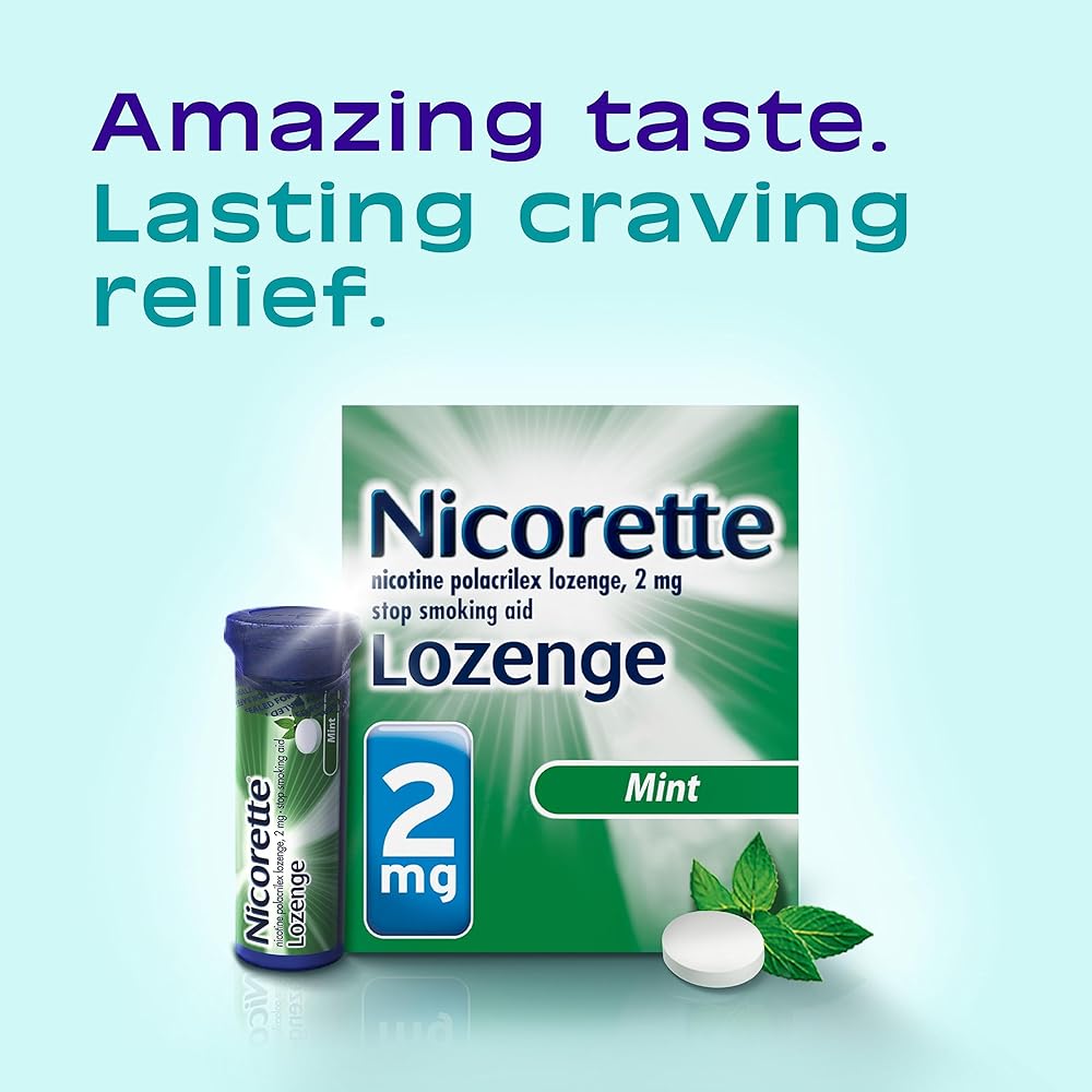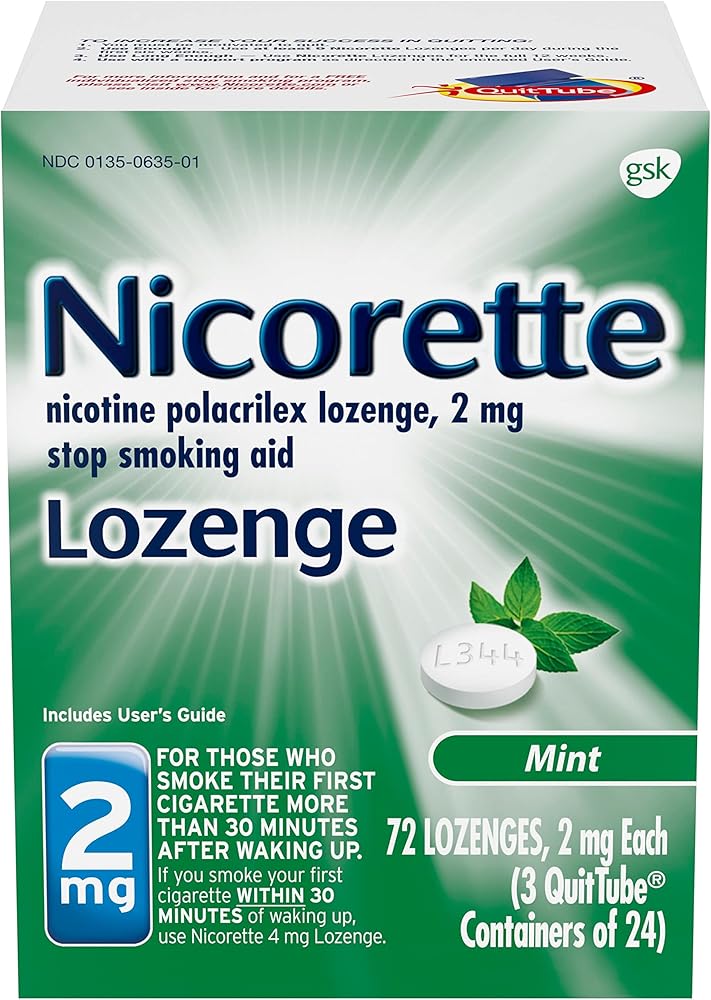 Nicorette 2 mg Nicotine Lozenges to Quit Smoking help you control cravings associated with smoking, enabling you to manage the triggers that link cigarettes to your daily activities. These lozenges are stop smoking aids that work by slowly dissolving to release therapeutic nicotine, curbing cravings and reducing the anxiety, frustration, irritability and restlessness associated with quitting smoking even after the lozenge is gone. With a refreshing mint flavor, these quit smoking products are perfect for those who prefer not to or cannot chew gum and want to control their daily nicotine intake as they quit smoking. Available in a convenient dispenser that fits easily into a pocket or purse, this stop smoking aid is a great choice if you want a discreet and portable option you can take with you on the go. If you smoke your first cigarette within 30 minutes of waking or if you smoke fewer than 10 cigarettes a day, start with 2 mg nicotine lozenges as part of your OTC nicotine replacement therapy. Take control of your quit with Nicorette Nicotine Lozenges to Stop Smoking.