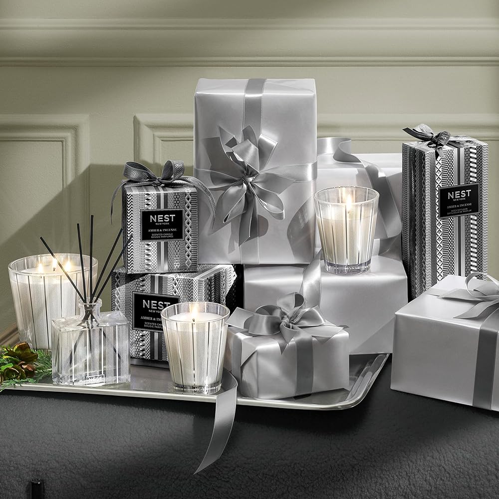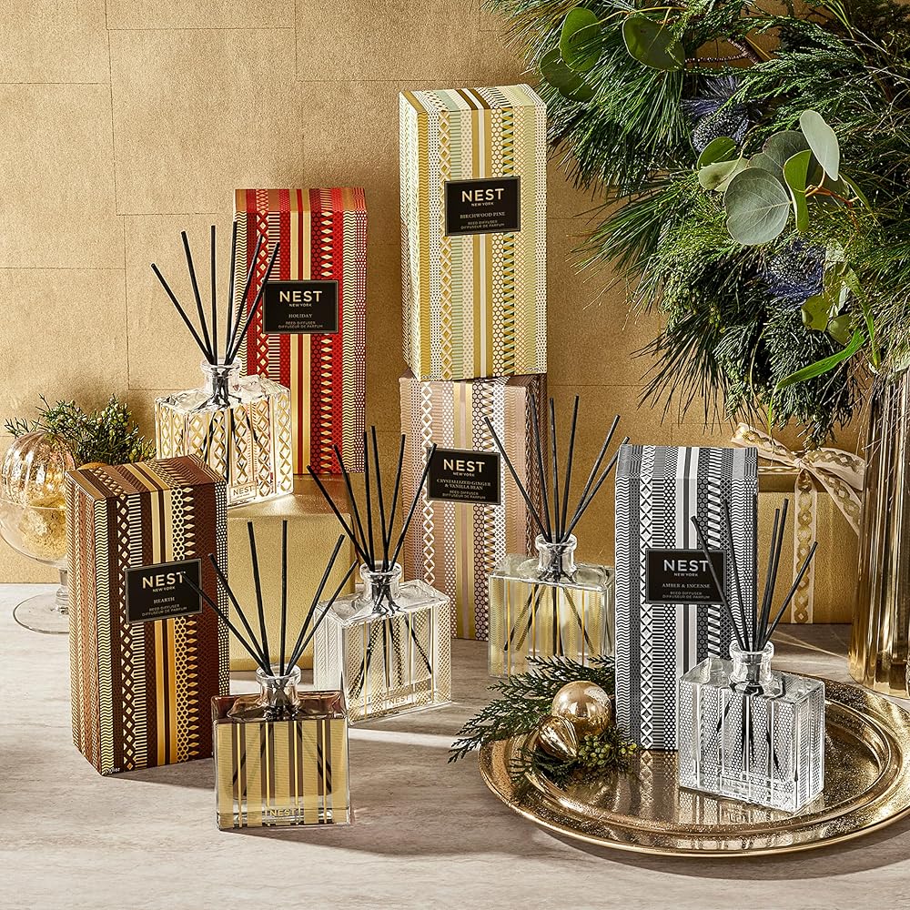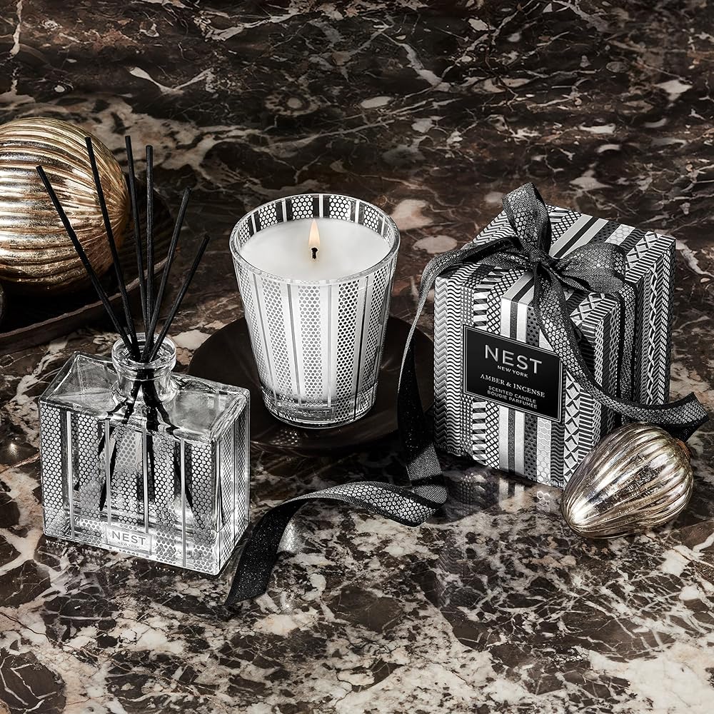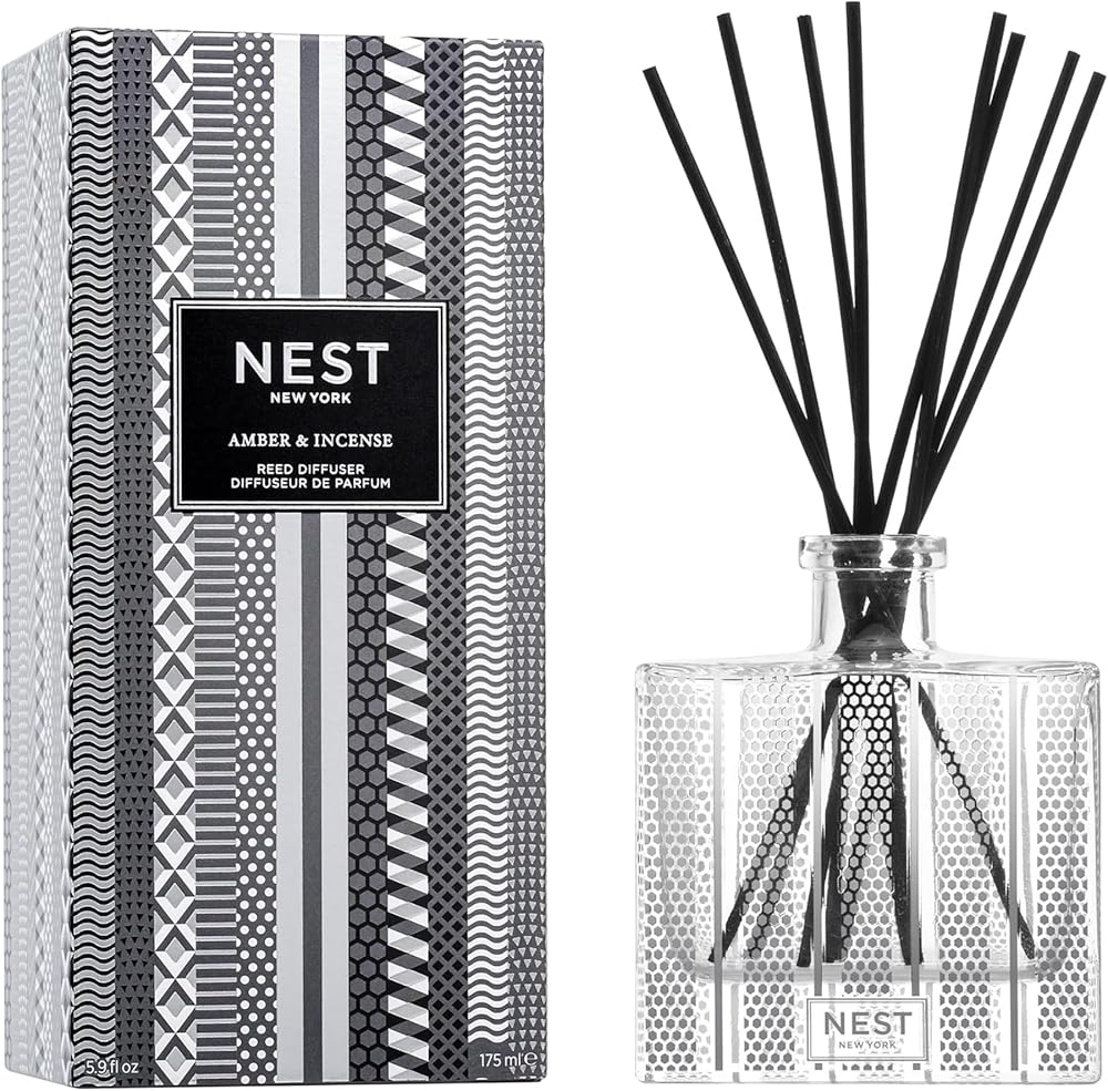 Enjoy exquisite, uninterrupted home fragrance for up to 90 days with the NEST New York Amber & Incense Reed Diffuser. Expertly crafted in the USA with the highest quality alcohol-free fragrance oils, this reed diffuser is housed in a glass vessel with a festive, metallic silver design that effortlessly complements any holiday décor. Rich notes of crisp black amber, frankincense, and aromatic cedar offer an exotic take on ancient traditions. The glass vessel measures 3.75 inches wide, 4.5 inches high, and 2 inches deep. Eight all-natural rattan reed sticks and 5.9 fluid ounces of oil are included. The intensity and reach of the fragrance can be customized based on the number of reed sticks used. As part of an ongoing commitment to cruelty-free practices, NEST New York has been certified by PETA, a leading organization that certifies brands that operate without animal testing. NEST New York is moving toward a more sustainable future with cartons made from sustainably sourced materials. NEST New York's fragranced home, perfume, and body care collections transform the everyday by artfully blending notes of the familiar, the exotic, and the unexpected for a fragrance experience like no other. Let NEST New York scent your world.