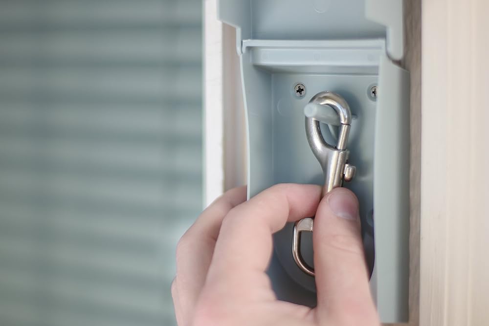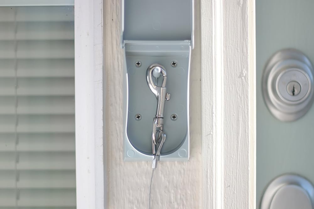 Mounting hardware and instructions are included. Simply install the Intelli Shield next to your door, or in a location convenient for you and at a height that is comfortable for you. When your pet is ready to come in, hang the leash/pet tie out clip inside the shield and close its door. Next time you are ready to secure your pet outside, the clip will be waiting for you without the need to bend down or retrieve it from under the ice and snow!