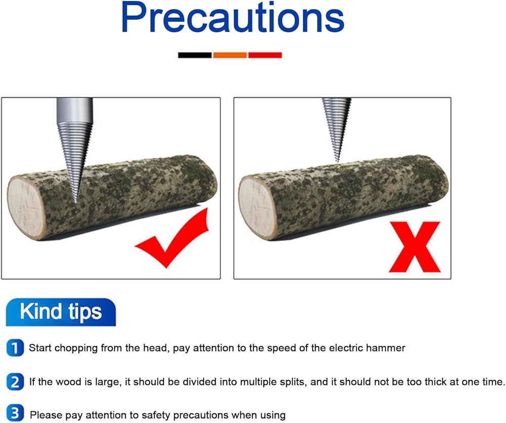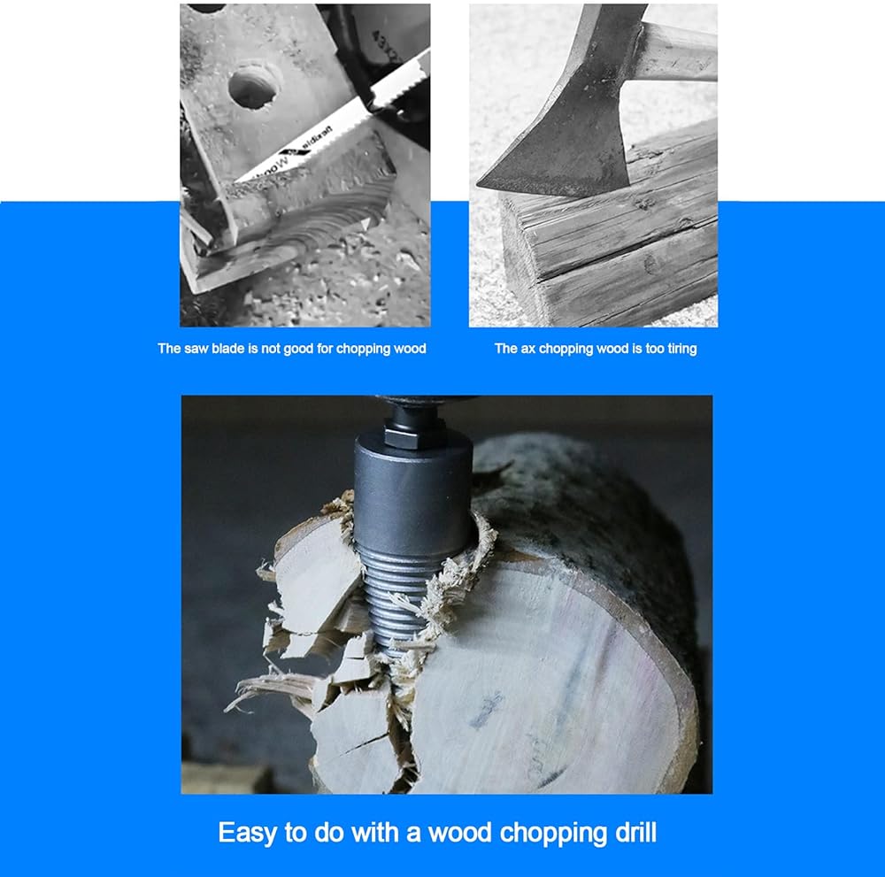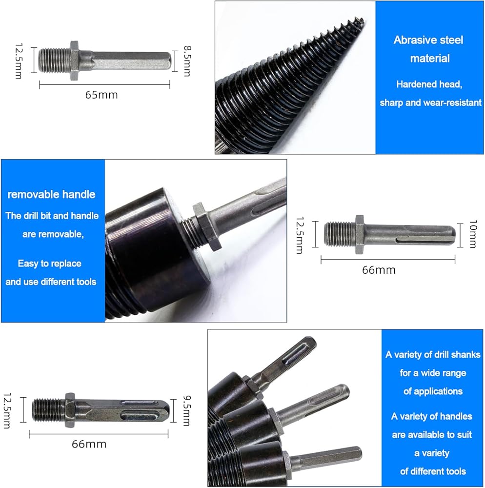 High Quality Drill Bit for Wood: Made of high quality high carbon steel. All kinds of soft and hard wood can be opened. Quick separation of logs and increased productivity. It's exceptionally strong, impact resistant and wear resistant. Package Included: 2 x Wood Splitter Drill (32mm、42MM) 3 x Handles ( Square Handle+Round Handle+Hex Shank ) Feature: -The product is integrally formed without splicing and is more sturdy that is more comfortable to use. -Hardening treatment, high hardness precision, wear resistance, durable to use. -Grooved anti-slip design for long hours of work, making work feels comfortable. -You can easily spill large firewood, wood at home, make it easy work, save energy and time. -This drill is suitable for a wide range of use, whether it is family, camping, or farm, can be easily used. Notice: 1. Size in 1-3cm size difference is in normal range due to manual measurement. 2. To start splitting from the edge of the wood, the large wood needs to be split several times 3. If you have any problem, please contact us to help you solve it.