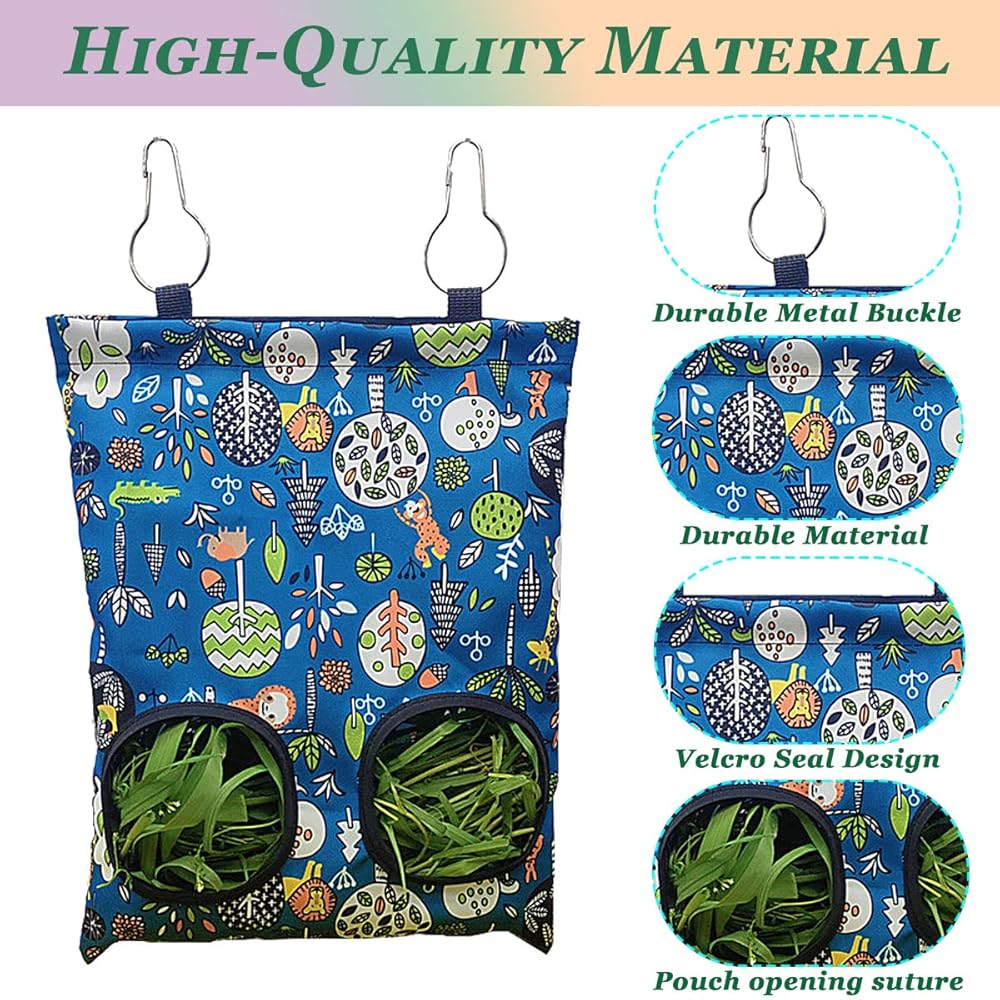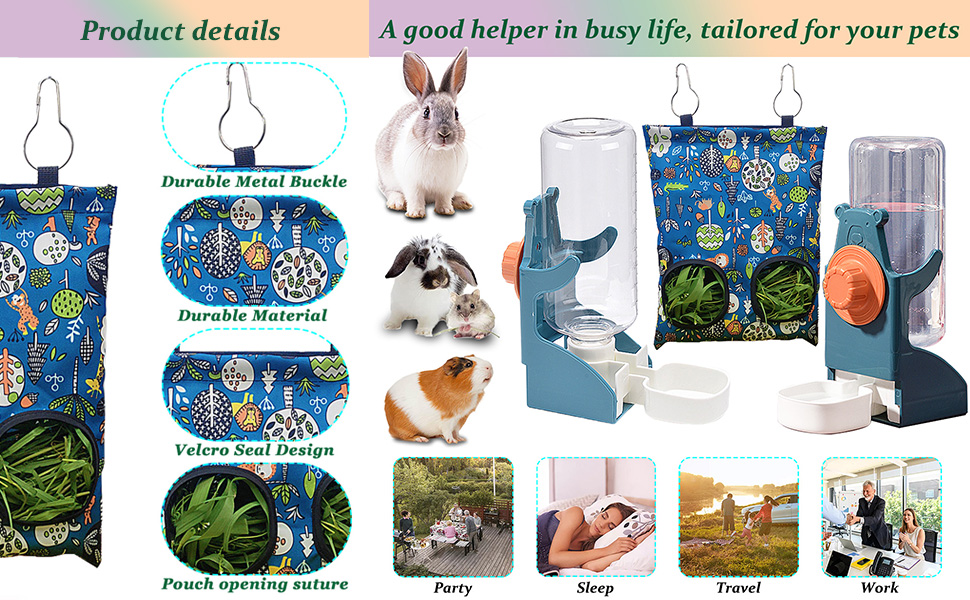 ✅【Safe and Environmental Material】: BPA-Free. Our water dispenser uses food grade plastic material, non-toxic odor free, so that your pet away from the harm of poor plastic. This premium hay feeder is made from 600D Oxford fabric and has reinforced the edges of the holes to ensure a durable and long-lasting haystack bag for your precious pet. High quality hay feed is sewn tightly, resistant to wear and tear, and prevents the haystack from being torn by small pets