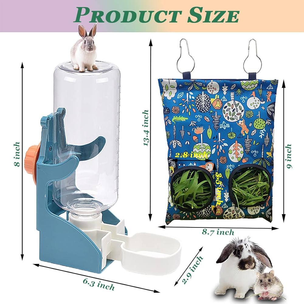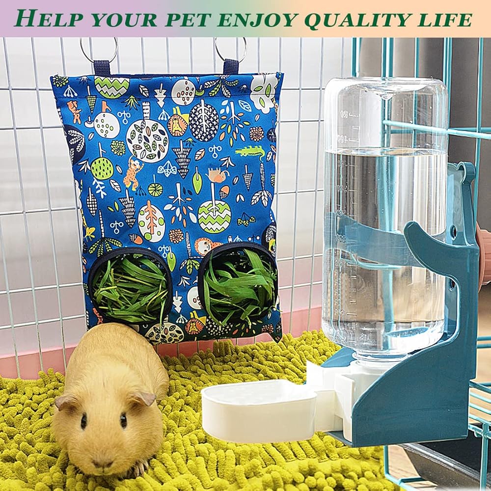 Kenond Rabbit Hay Feeder Water Dispenser Set, Hanging Guinea Pig Hay Feeder Bag Water Bowl for Cage, Rabbit Cage Accessories, Automatic Small Pets Hay Water Dispenser Storage Bag for Bunny Hamsters