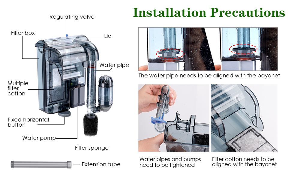【أنبوب مياه قابل للتعديل + أنابيب ممتدة】يمكن تعديل طول أنبوب المياه بحرية للتكيف مع خزانات الأسماك ذات الارتفاعات المختلفة، مع أنبوب تمديد، يمكن تركيبه بحرية وفقًا لارتفاع خزان الأسماك. خزان مياه خارجي بمستوى الحاكم، يستخدم للتكيف مع سمك خزانات الأسماك المختلفة والحفاظ على الفلتر عموديًا.