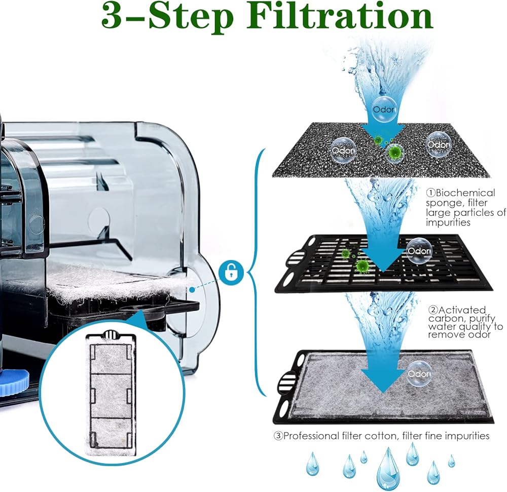 【ترشيح بثلاث خطوات】تمنع الإسفنجة الكيميائية الحيوية عند مدخل المياه استنشاق الرمل والأسماك. يحمل الماء المستنشق فضلات الأسماك والشوائب الأخرى، ويمر عبر طبقة من الإسفنج الكيميائي الحيوي، وطبقة من وسائط الكربون المنشط، وطبقة. من قطن الفلتر الاحترافي لتحقيق وظيفة تحسين جودة المياه. يمكن استبدال طبقة الفلتر، ويوجد في المتجر طبقة فلتر منفصلة للبيع.