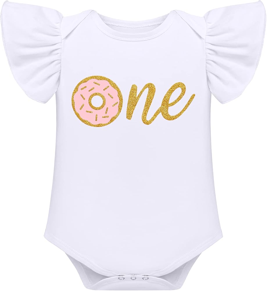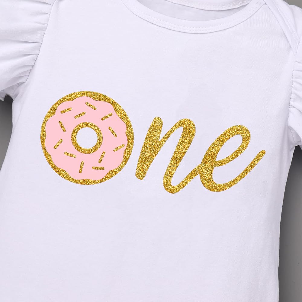 🧡🧡【Pink Donut Letters Romper Shirt Top】Baby girls Donut strawberry first birthday outfit romper tutu skirt headband set with leg warmers clothes. White summer ruffle flutter sleeve o-neck romper / t-shirt tops, printed with glitter shiny letters, Donut one / two / three / Half Way to One birthday, Donut strawberry my 1st / 2nd / 3rd / 1/2 birthday, special for celebrating your little one's BIRTHDAY. Lapped shoulder bodysuit, open crotch with 3 snaps for changing diaper cover conveniently