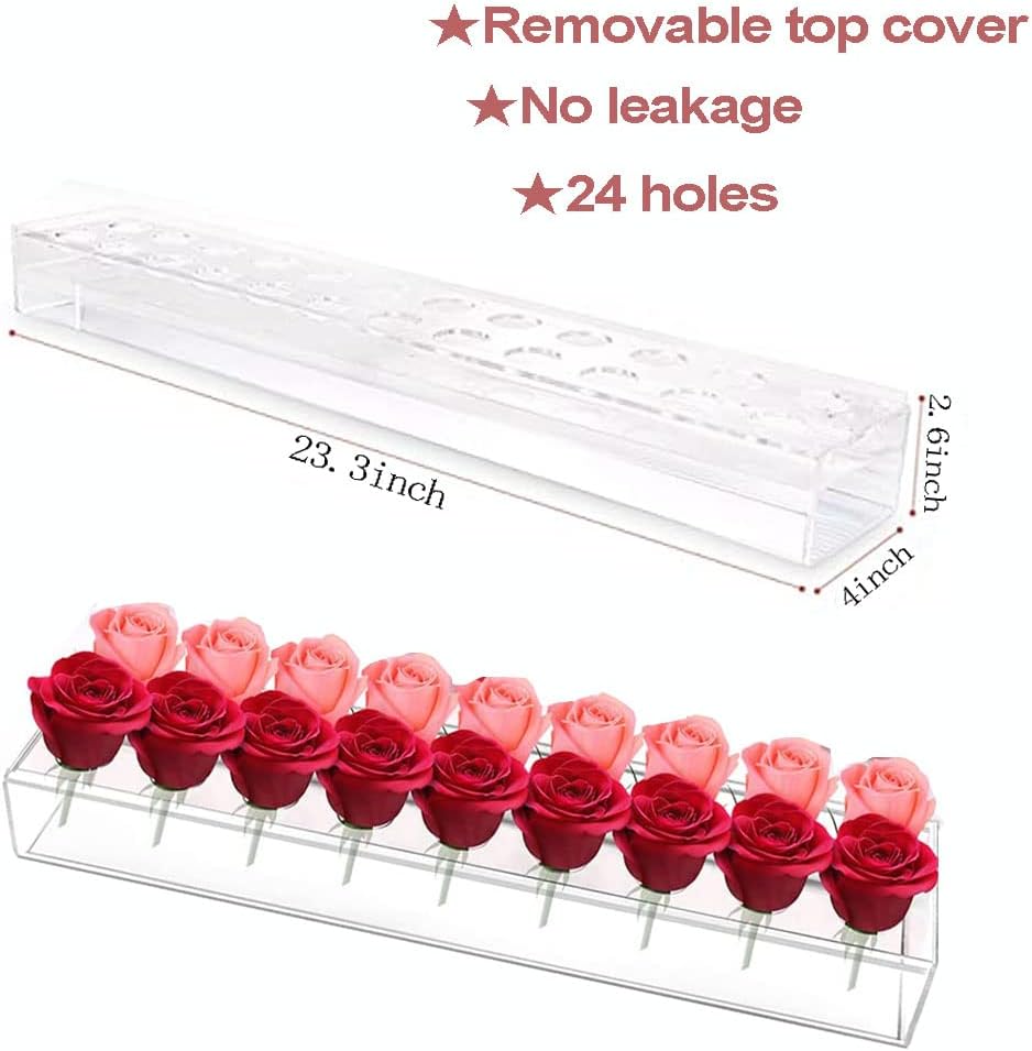 【Suitable Size Centerpiece Vases for Table】: Size of the long acrylic vase with holes is about 23.3 x 4 x 2.6 inch, 0.12 inch thick, there are 24 holes for you to get the flowers in in it, with this low laying acrylic vase, it becomes easy for the guests to interact with each other.