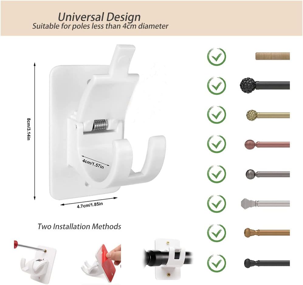 【8Pcs Curtain Rod Hooks with Screws】You will receive 8 pcs universal plastic self adhesive curtain rod brackets with screw, the curtain pole brackets measure about 3.15 x 1.89 x 2.36 inch. Can hold all kinds of curtain rod sizing from 0.6'' to 1.5', satisfy all your needs for holding your curtain.