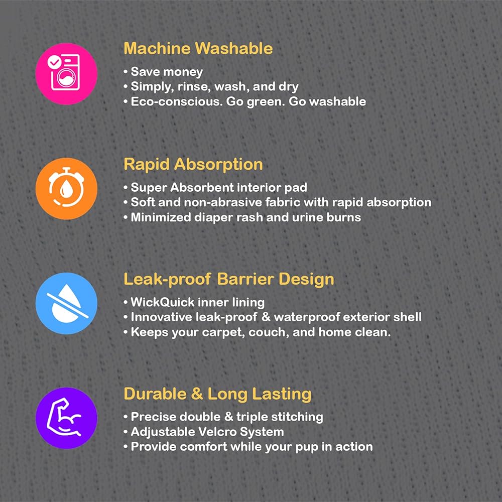 • HIGHLY ABSORBENT DOGGIE DIAPERS - The diaper pad is sewn into the diaper and has a waterproof outer layer to prevent leaks and damage to rugs, carpets, upholstered chairs and sofas.