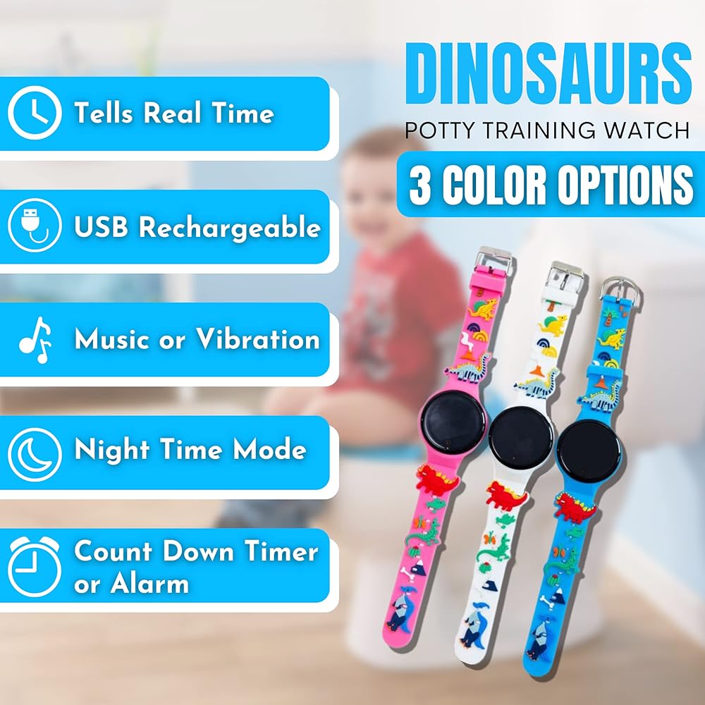 Kid-Friendly Design – Our potty training watch is designed with kids' tastes in mind. Fitted with a 3D dinosaur strap, you will have no problem trying to convince your little one to slip on this playful-looking potty alarm. Our toddler smart watch with timer is available in white, blue, and pink, making it a great potty training watch for boys and girls.