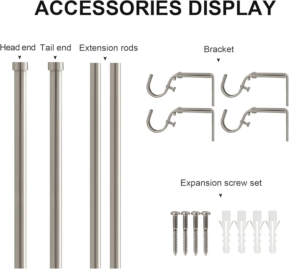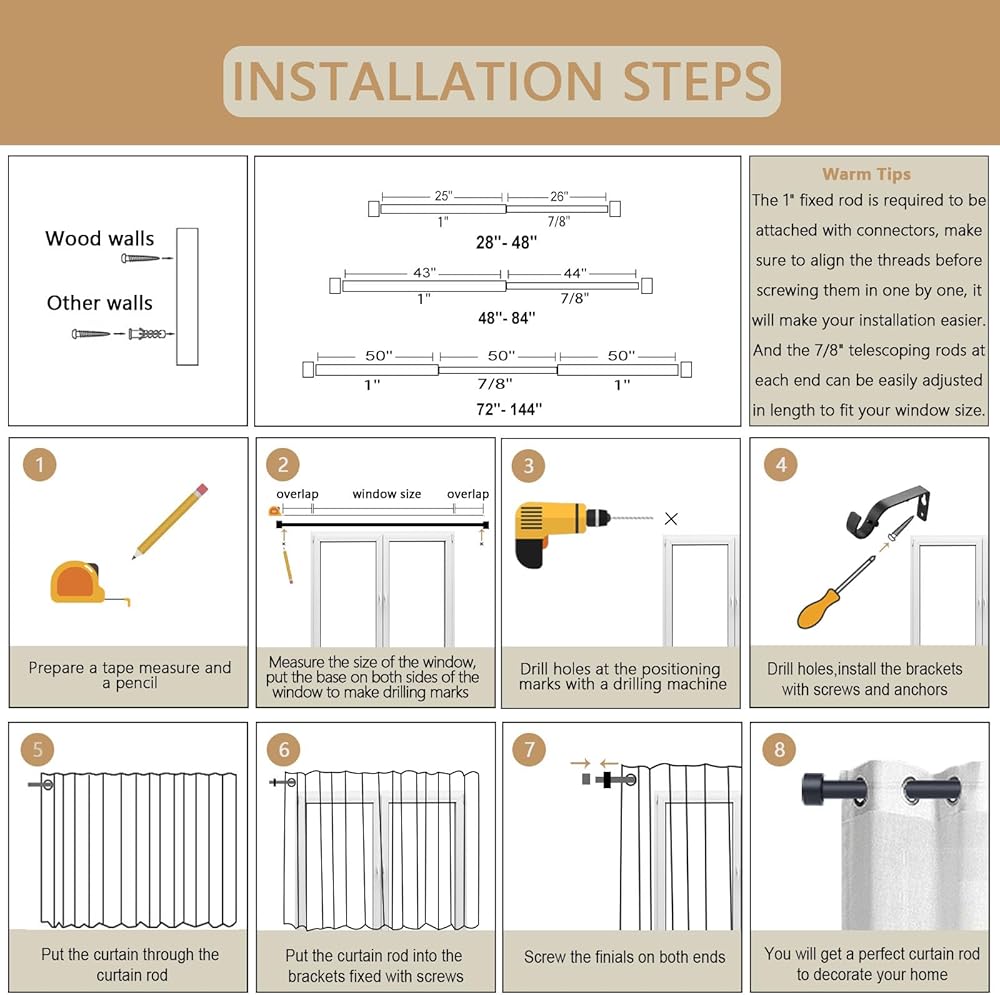 Easy to Install:Prepare the installation tools and our matching hardware accessories.Our package includes installation instructions,follow the steps according to the step-by-step installation diagram,you can simply and easily complete the mounting of this curtain rods.
