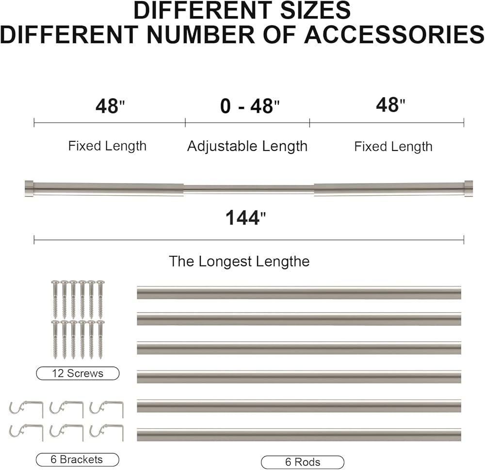 Adjustable Curtain Rod:2 Pack 72 to 144 inches include 4 outer rods,2 insert rods,4 finials,6 brackets ,12 screws & anchors and installation instructions.OLV curtain rod has 5 sizes,which can extend from 18 to 28 inches,28 to 48 inches,48 to 84 inches, 72 to 144 inches and 120 to 170 inches,You can choose from these 5 sizes based on the size of your window.